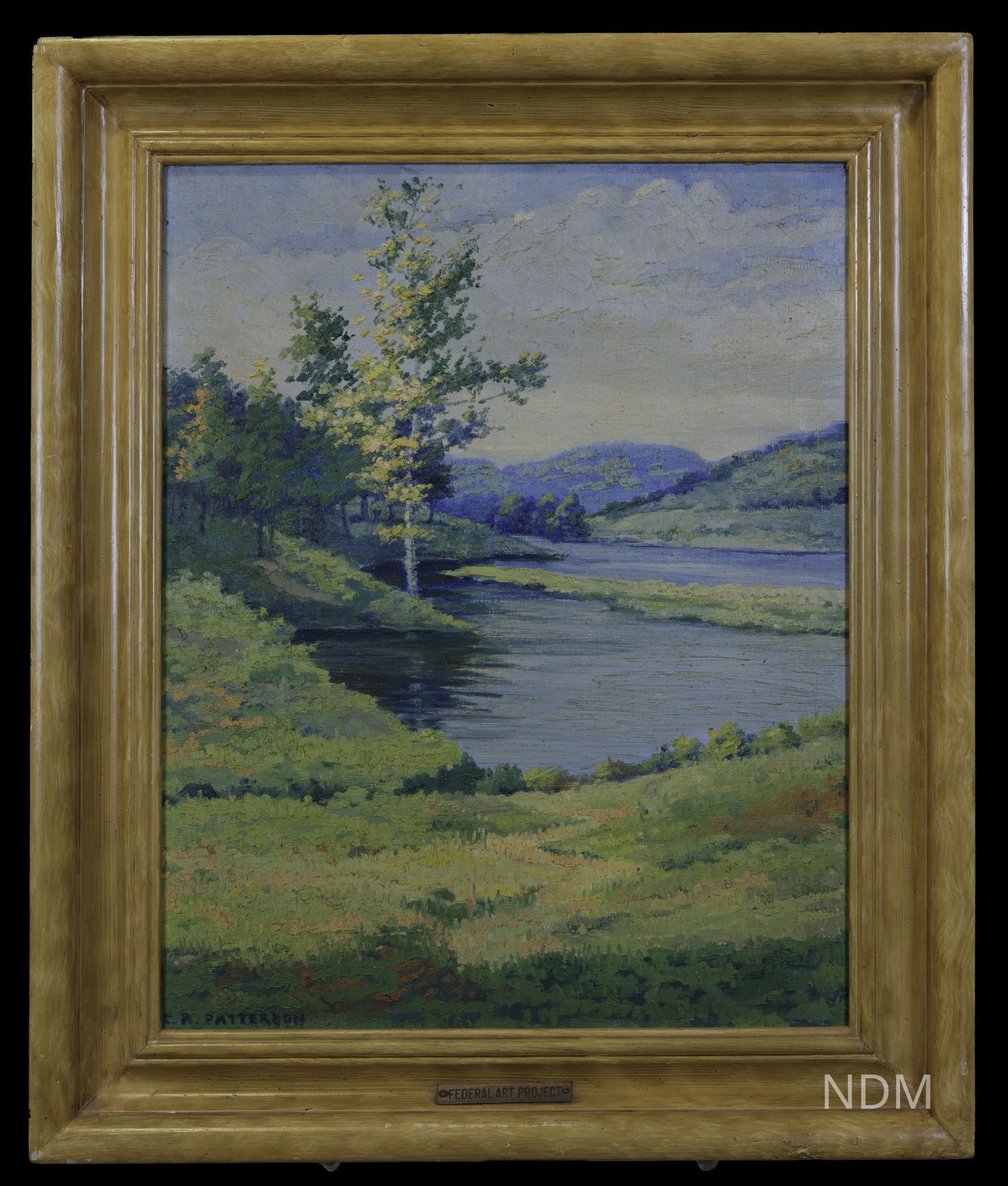 Given its light greens and the implied blossoms of field flowers, Patterson’s landscape may be set during springtime, in which case the lake pictured here still would be filled with meltwater. His fresh, pastel-shaded scene celebrates nature with any traces of the human carefully cropped out of visible range.Collection