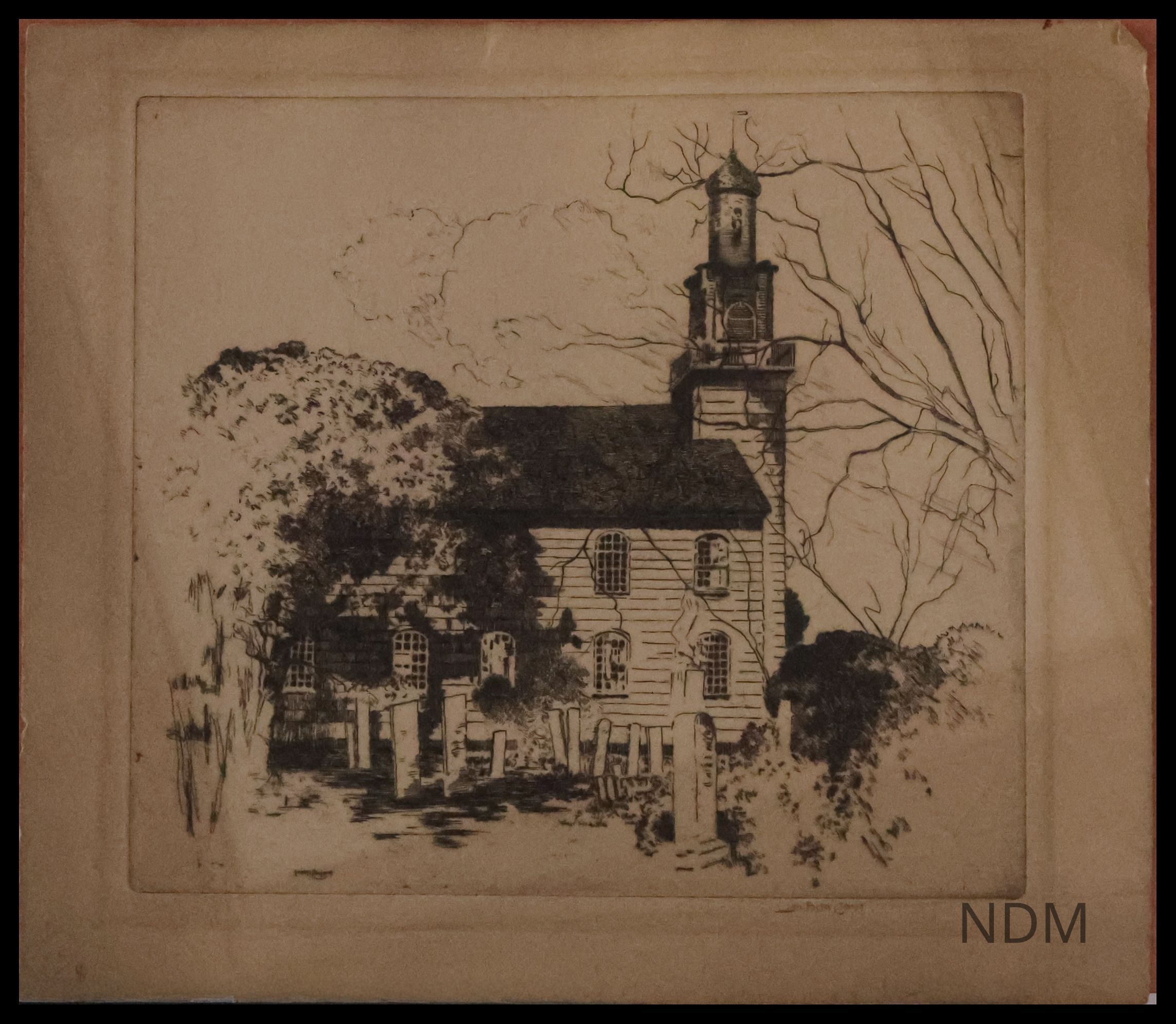 The identity of this unusual church isn’t clear. Its design and steeple are characteristic of many found throughout New England; at the top of its steeple is an “onion dome” turret usually found on Russian or Greek Orthodox churches. Jones may have found that interesting subject matter, along with what appears to be a very old graveyard. Lightly etched environmental details—clouds, trees, bushes—surround the central building like a nimbus.Collection