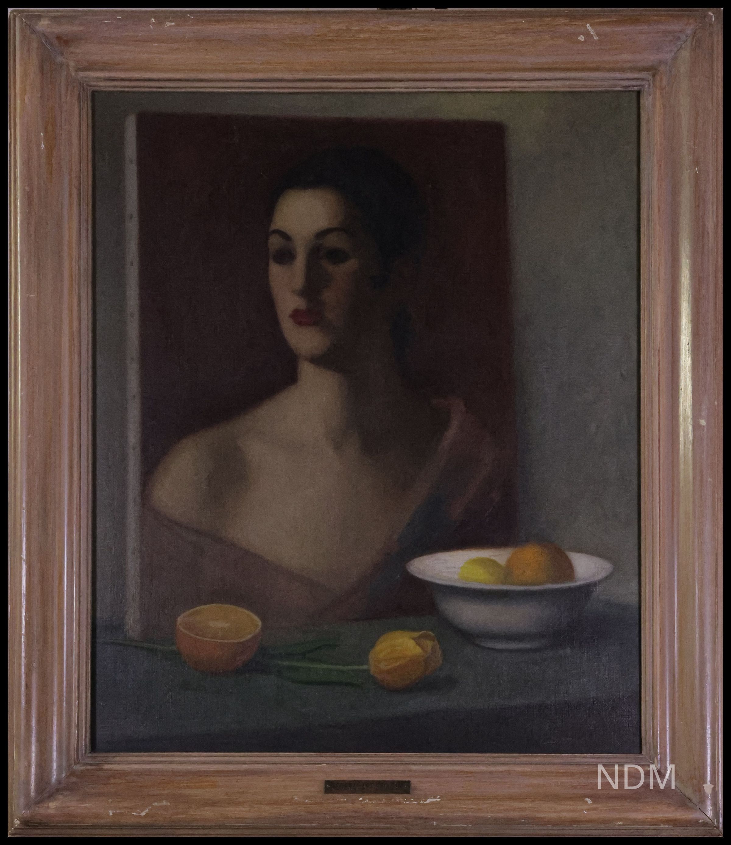 A portrait of a woman looks off, away from a light source igniting the glaze on the canvas, casting a white glow across the surface: below her sits a still life layout of like-colored objects. In the shadow rests a cut-open orange sitting on the stem of a tulip of a similar hue. Beside it is an off-white bowl, holding unidentifiable fruitsCollection