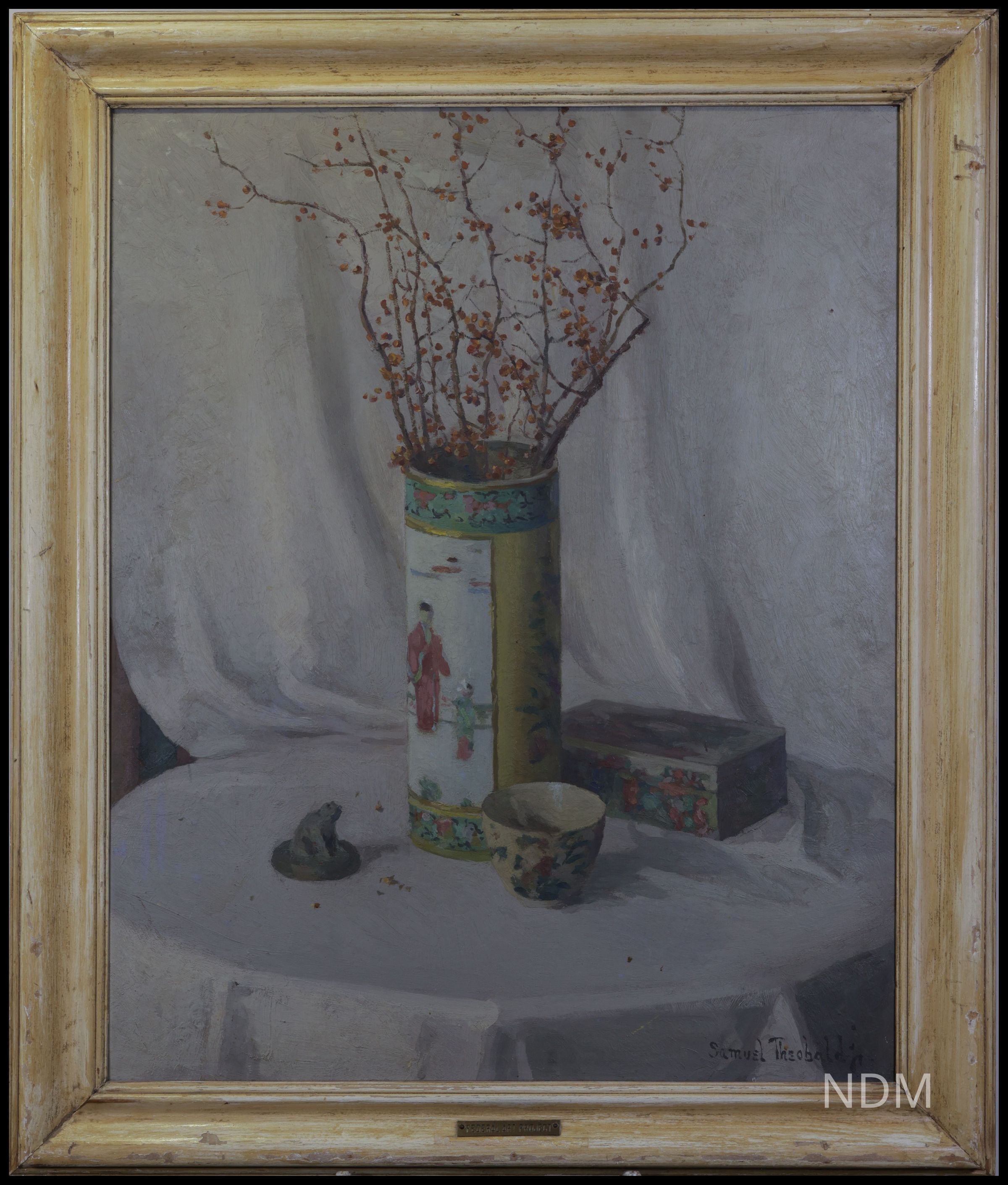 A table, draped in eggshell cloth and situated in front of a curtain of the same color, holds a vase containing cherry blossoms, a tea cup, a decorated box—perhaps a tea chest?—and a small statue of a frog. Each of the items seems to evoke East Asian influences, such as the woman on the vase wearing a Japanese kimono, and the frog, a traditional symbol of good luck in Japan. The painting’s title alludes to myriad connections in the world, an encompassing family including but not limited to humans. A few blossoms on the table subtly remind us of temporal change.Collection