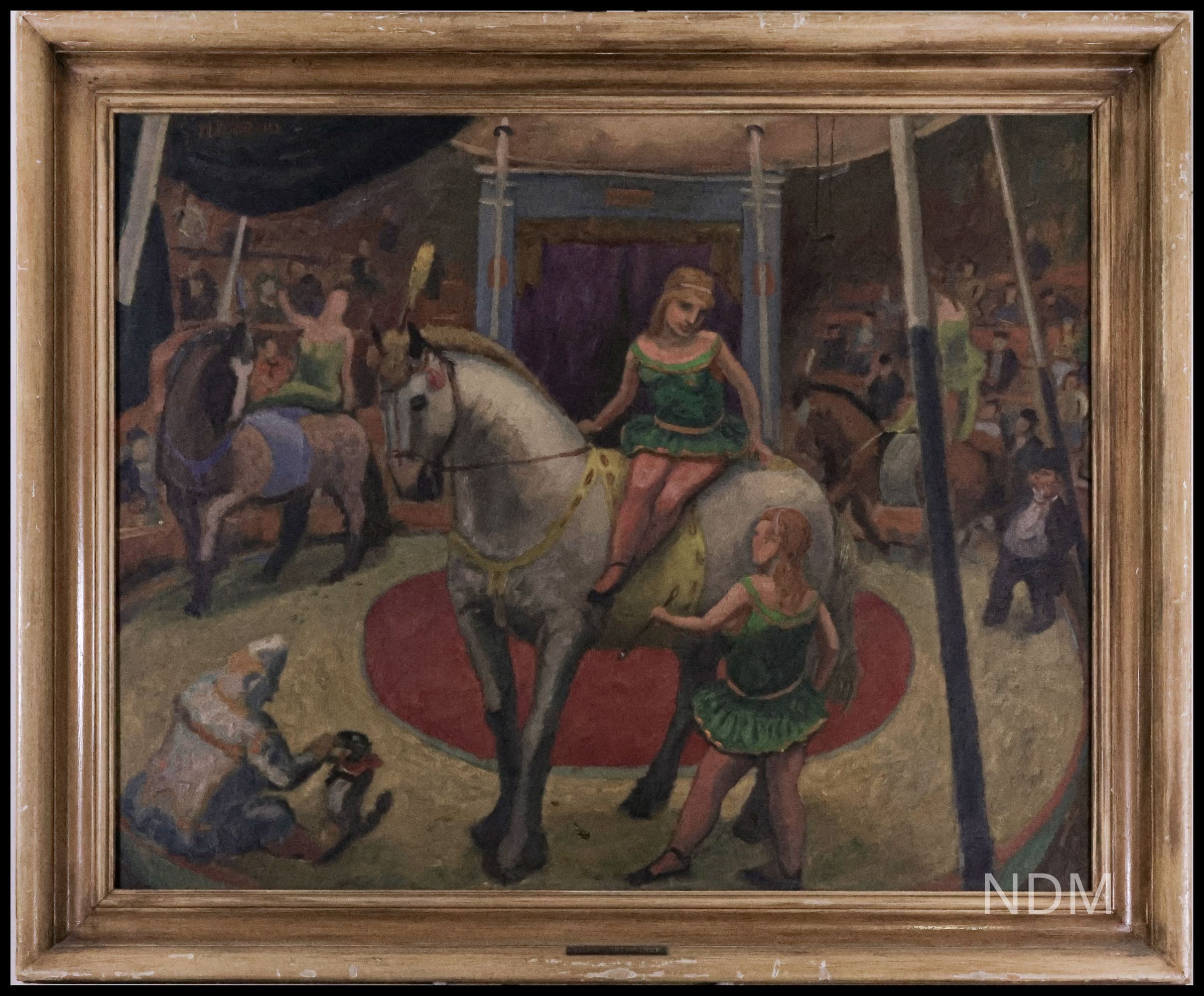 In circular composition, we behold a miniature world. Three glamorous horseback performers; a clown and his costumed dog at lower left; a crowd of spectators beholding the action: all orbit around a circular red carpet. At right is an ambiguous figure that may be a clown, dwarf, or even the show's impresario. Hondius, like many other modernist painters, was fascinated by circuses for their picturesque qualities, and perhaps more so for the marginal lives gathered under a tent.Collection