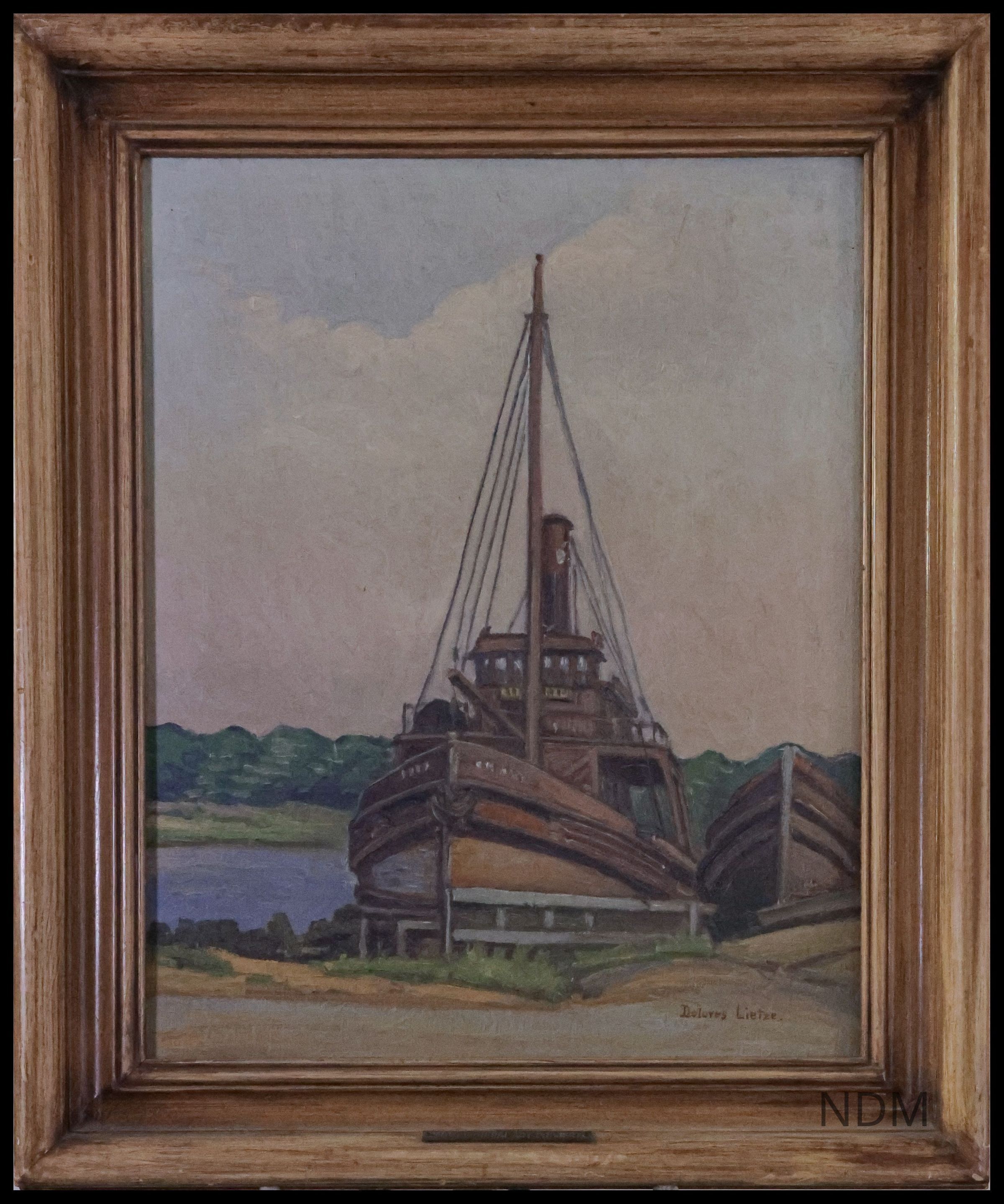 A lighter was a type of barge used for unloading ships in shallower harbors; in the early 20th century, the name extended to lighter tugs used to move those unpowered barges. Here, in golden tones and against a wall of clouds, the Good Hope also is depicted as an object of beauty. In the lower portions of Lietze’s painting, both her design and brushstrokes emphasize horizontal strata of road, wharf, water, planks, gunwales and, across the water, another line of vegetation and trees. The more spacious upper portion is reserved for the vertical geometry of mast and rigging.Collection