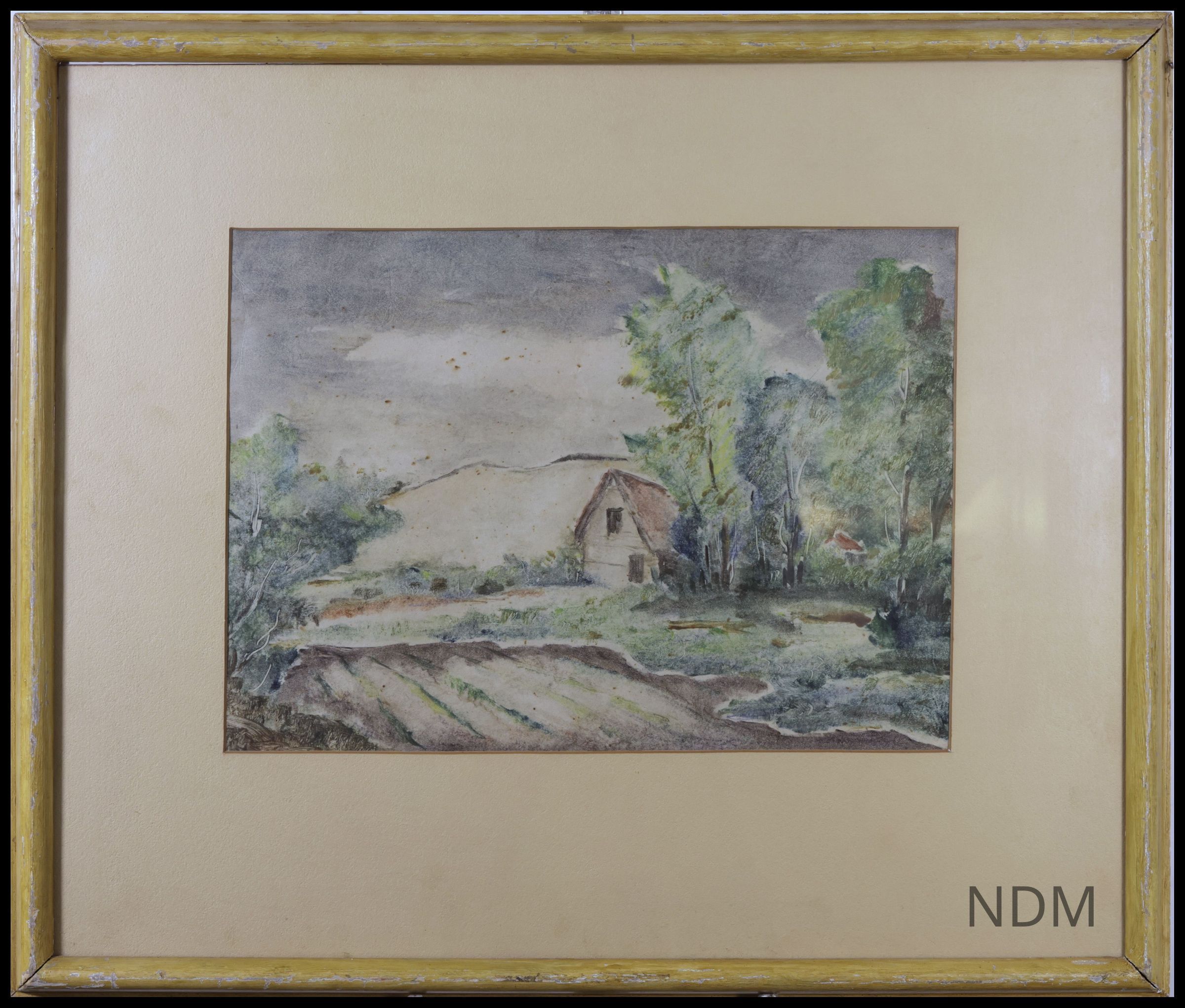 This scene at the edge of a forest is drawn using remarkably sparse details, for example a few brushstrokes evoking a vegetable garden, a house, or a hill. Much of Nakagawa’s attention has been devoted to dense and multicolored foliage at left and right—the only neighbors depicted here. The red object (or figure) in the woods isn’t clear. Sinuous unpainted and scraped lines are integral to the watercolor’s design.Collection