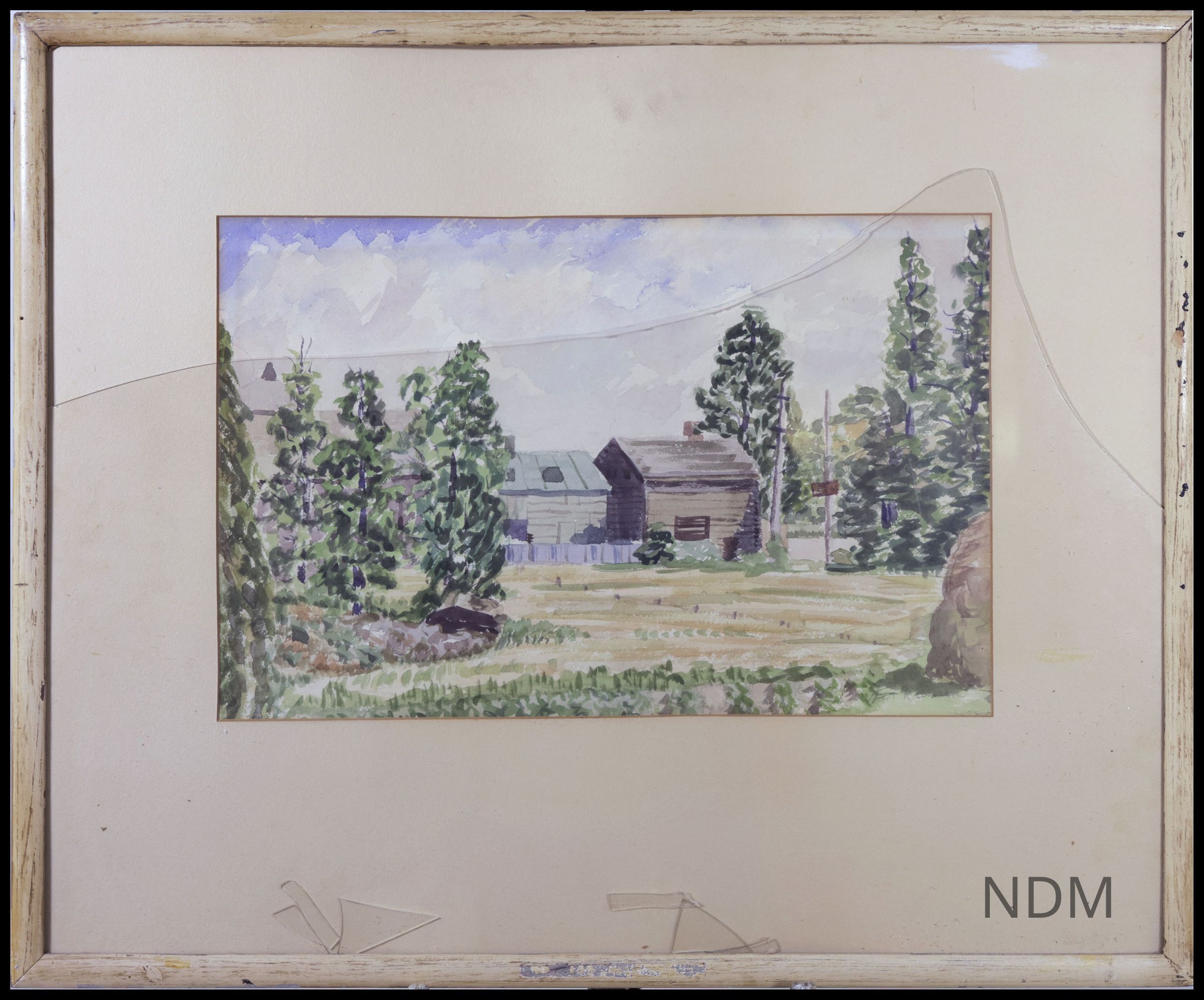 Across a field we see two small buildings next to a larger one mostly obscured by trees at left. Given their size and dilapidation, it can be inferred that the lives within the homes are humble ones—perhaps agricultural workers, given the pile of hay at right. Telephone or electrical poles are visible near a road at right, along with an unreadable sign. Ramer’s subtle composition emphasizes the things we don’t know about the woods house(s), but they’re tucked into the center of his painting. Note: the line across this painting is due to broken glass in the painting’s frame.Collection