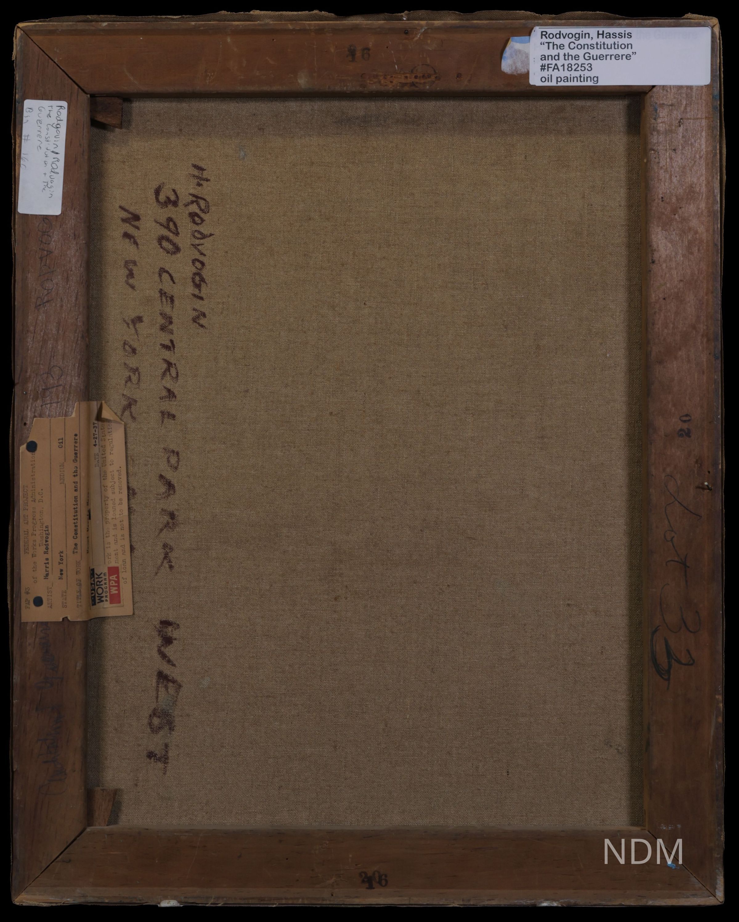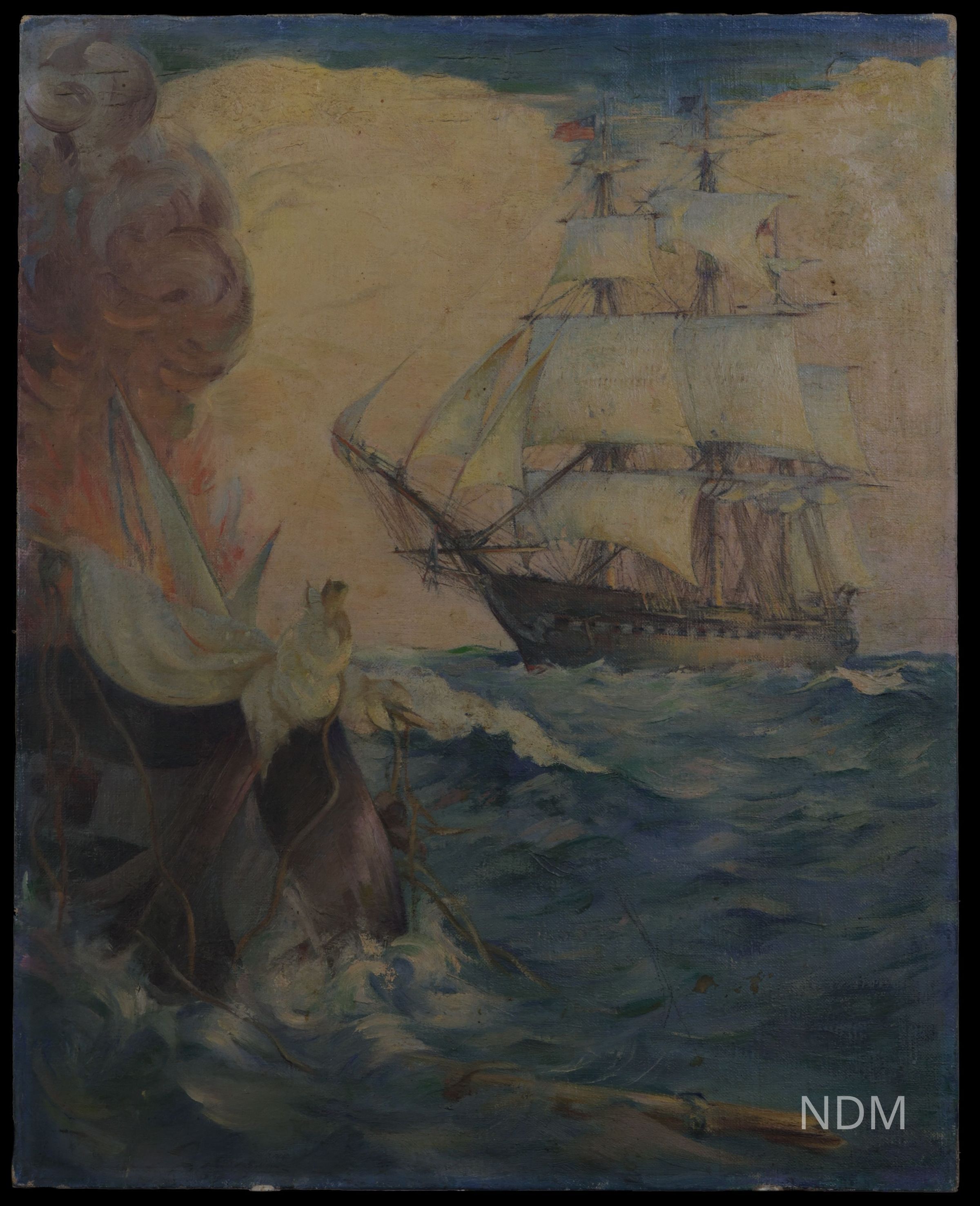 This painting depicts a naval battle of consequence, during the War of 1812, between the USS Constitution and HMS Guerriere some 400 miles southeast of Nova Scotia. The latter ship was only part of a Royal Navy with a large numerical advantage, enforcing a blockade upon American merchant ships. In Rodvogin’s composition, we see the defeated English ship set afire and sinking in the foreground—its crew having surrendered and now prisoners aboard the Constitution with the American flag flying proudly. Massed clouds provide a dramatic backdrop. In this the painting is accurate, for its emotional impact proved crucial to public support for the war.Collection