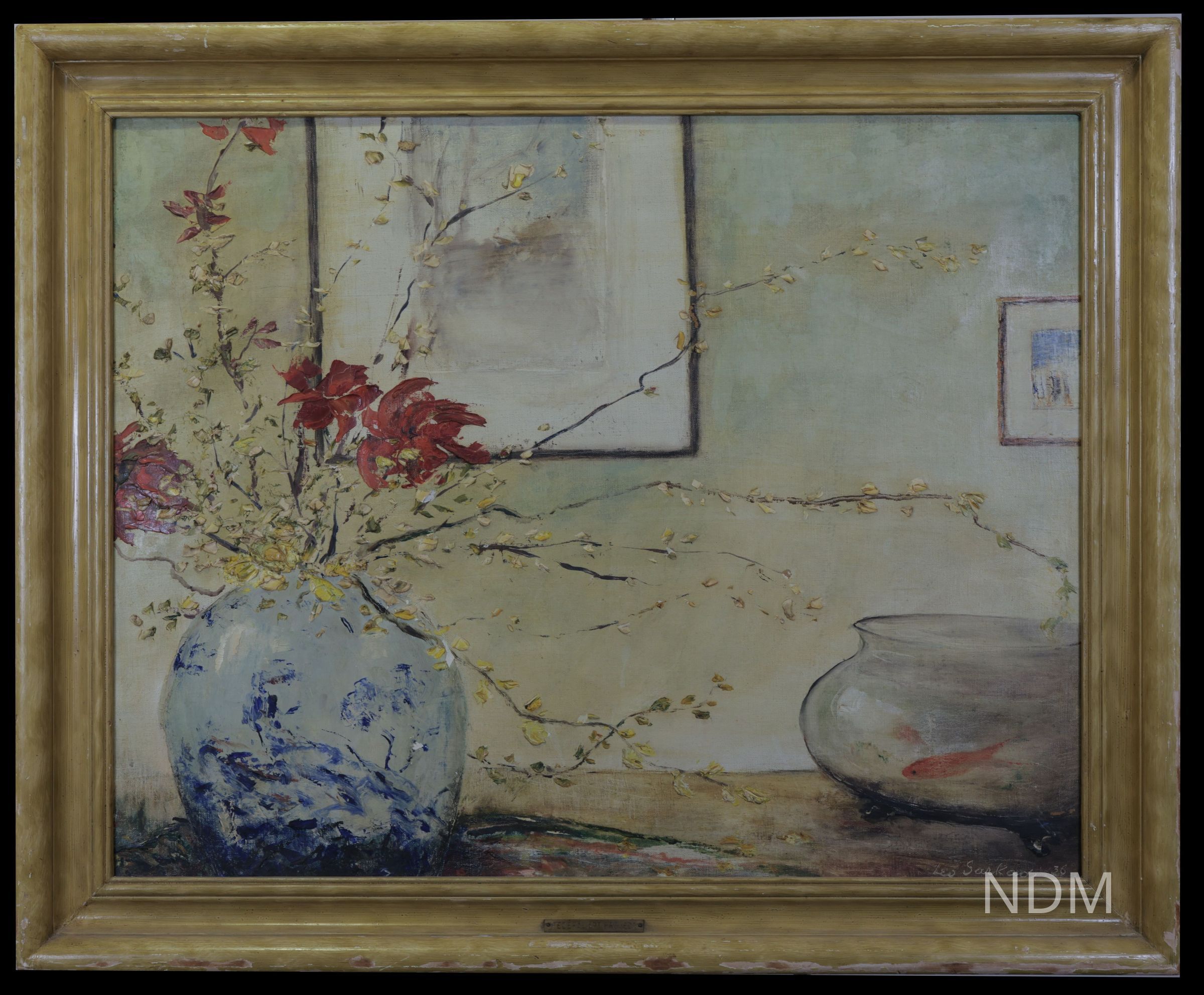 A striking composition is achieved with very few objects: the painting’s eponymous vase, a few flowers and blooming limbs, a goldfish bowl, and two paintings. Carefully outlined shapes play against a scattering of colors applied thickly—even three-dimensionally—to the canvas. A branch traces the meandering line between a vivid goldfish in the bowl and equally bright flowers held by the jar. The painting at left creates a window upon some outdoor scene.Collection