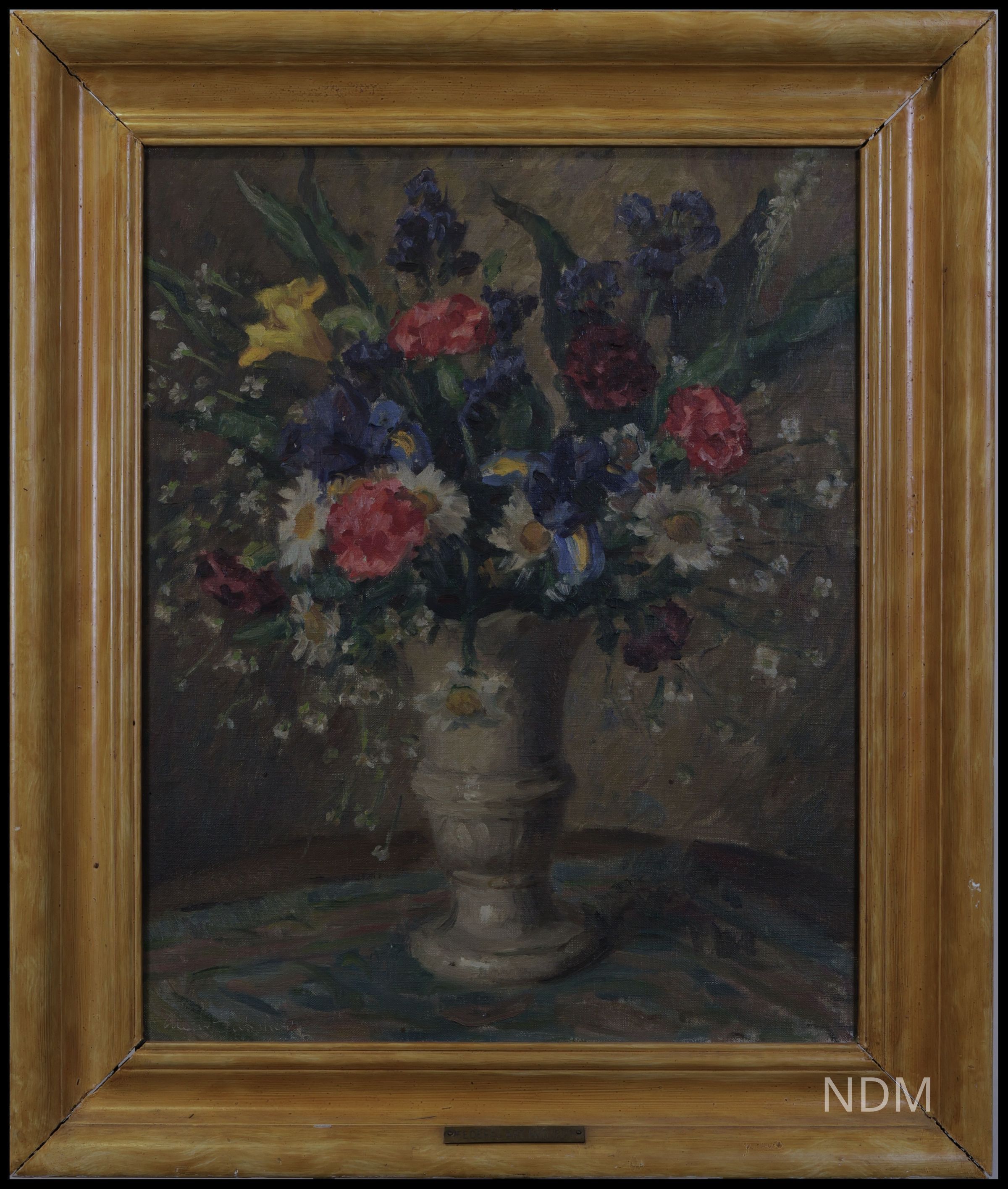 A table is the support for a Grecian-style vase containing flowers including carnations, daisies, irises, lilies, and baby's breath. These colorful flowers stick out against a dull brown background. Some of the flowers are noticeably droopy and the shading shows there is light hitting the vase from the left.Collection