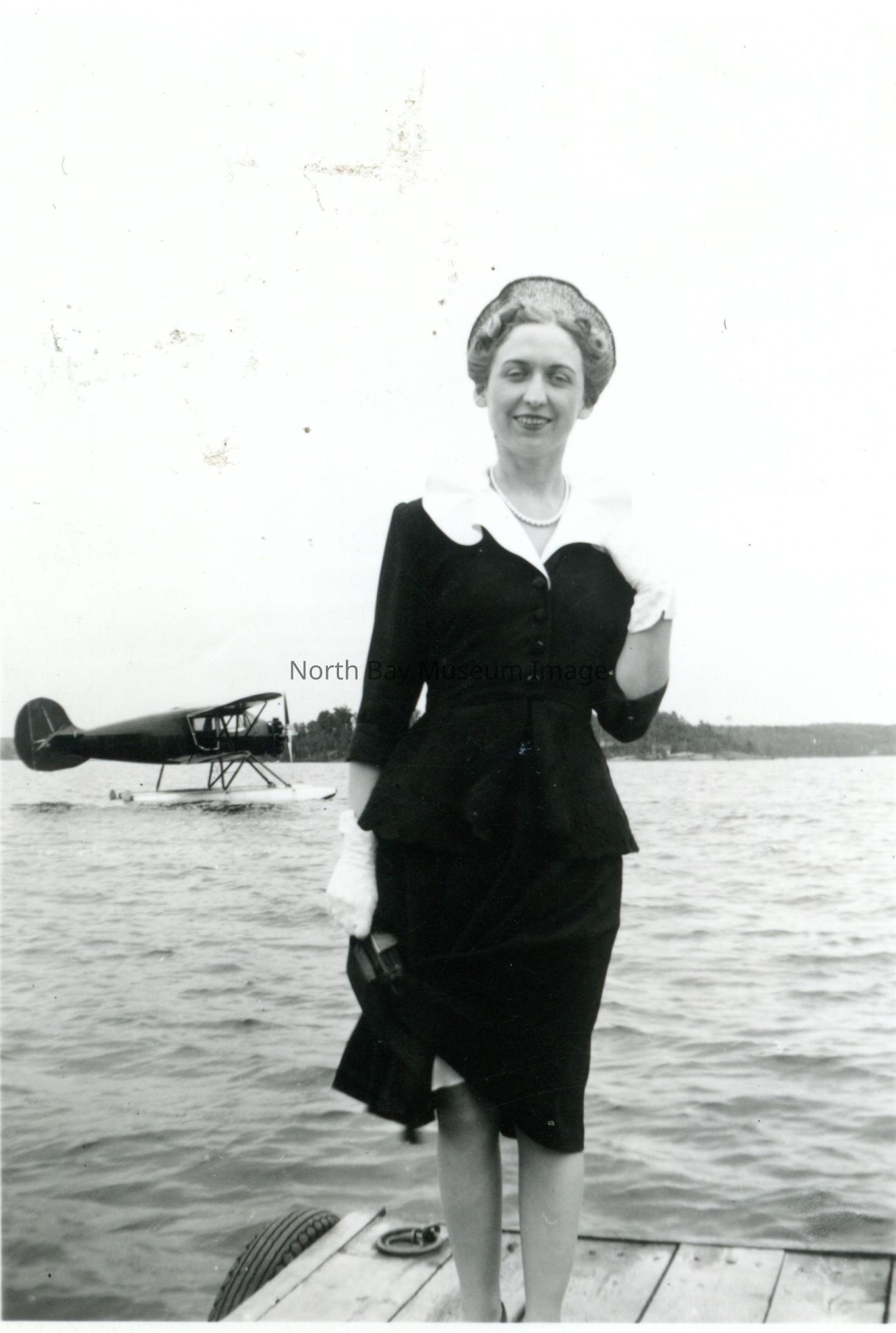 Photograph of Marjorie Wright, humane society founder, standing on dock in front of plane landing on the water behind her.