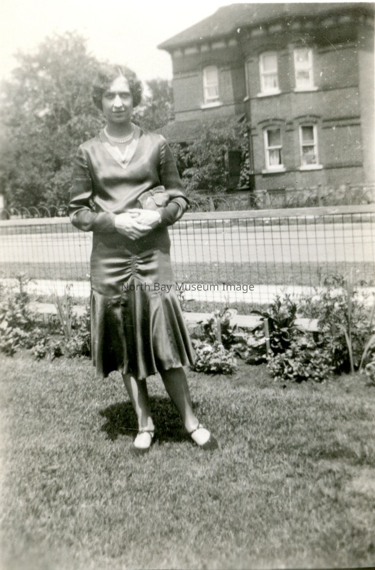 Photograph of Marjorie Wright, humane society founder, in dress in front of house.