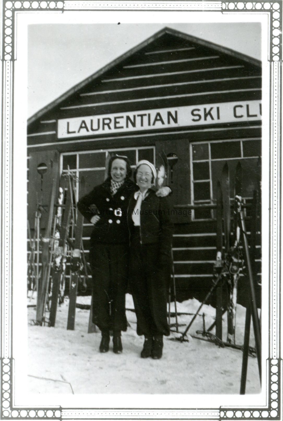 Photograph of two women, one might be Marjorie Wright, standing in front of Laurentian Ski Club chalet with sign and skis visible.