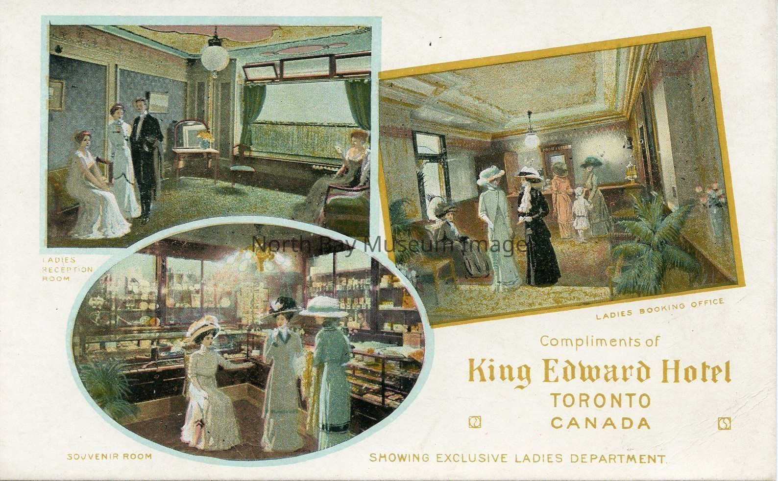 48c is a beige called postcard. The card has three smaller illustrations on the postcard. Two of the illustrations show people in old fashioned clothes sitting in one of the hotel rooms. The third image is of women dressed in old fashioned clothing sitting in a restaurant. One woman is sitting sipping tea. On the right handside in yellow text the postcard reads "Compliments of King Edward Hotel Toronto, Canada."
