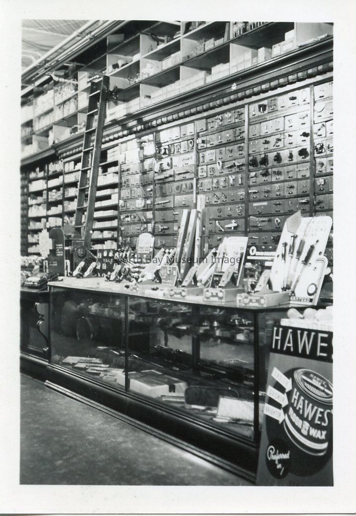 taken over by Bob's Hardware in 1970s. This store was purchaed by John Halliday in 1941. Original owners by J.W. McDonald later joined by Geo E. Hay and firm named “McDonald & Hay”. Eventually Geo. W. McDonald, son of J.W. took over the business and operated until 1941 until sold to John Halliday. Business was later sold to Robert Edwards in 1957. Information from "North Bay" by WKP Kennedy.