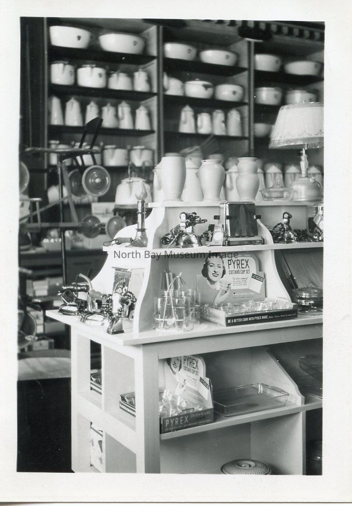 -Photo of John Halliday & Son Hardware. -White shelf with ceramic vases, lamp and box of Pyrex custard cup set. -On back, right as you enter store Feb. 4/41. -Number 29 stamped.