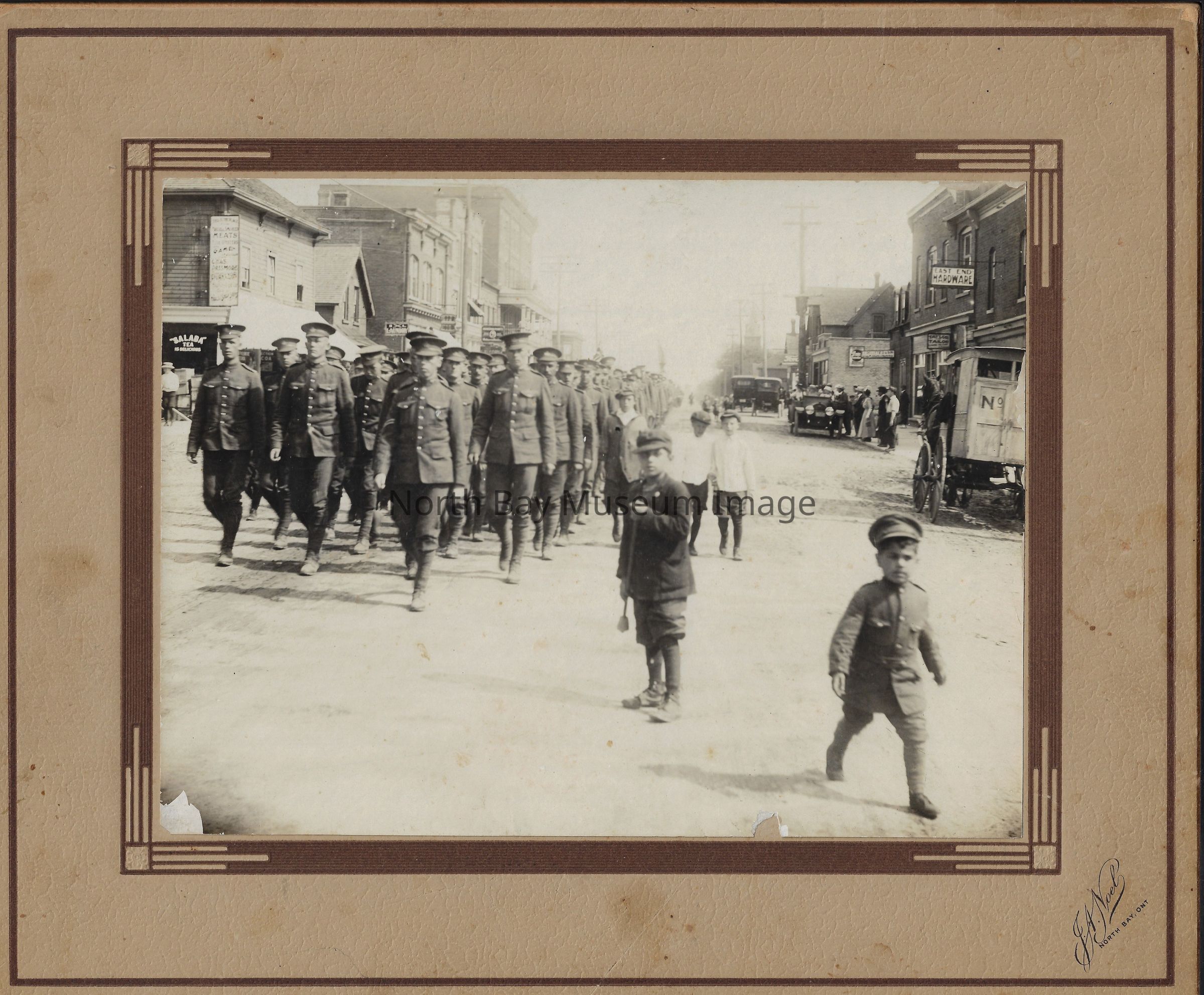 Photograph of the 159th Batallion marching in North Bay. Signts for East End Hardware, XL Laundry in background. A group of young boys including one child in miniature soldier uniform are walking beside the soldiers.
