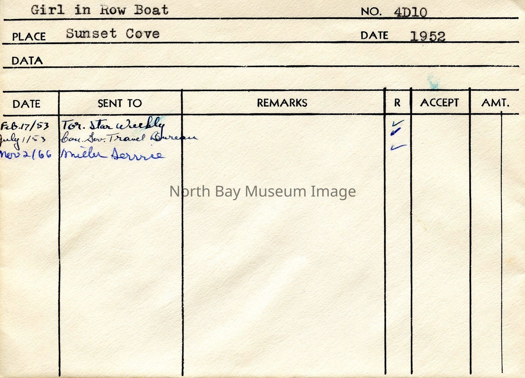 Envelope (a) containing negative (b) and photograph (c) of a girl in a row boat. The image shows a girl rowing away from the photographer in quite shallow water, at sunset cove. A part of the Forder Collection. The photographers orignal number was 4D10. All of the publications of the photo are listed on the envelope.Creator