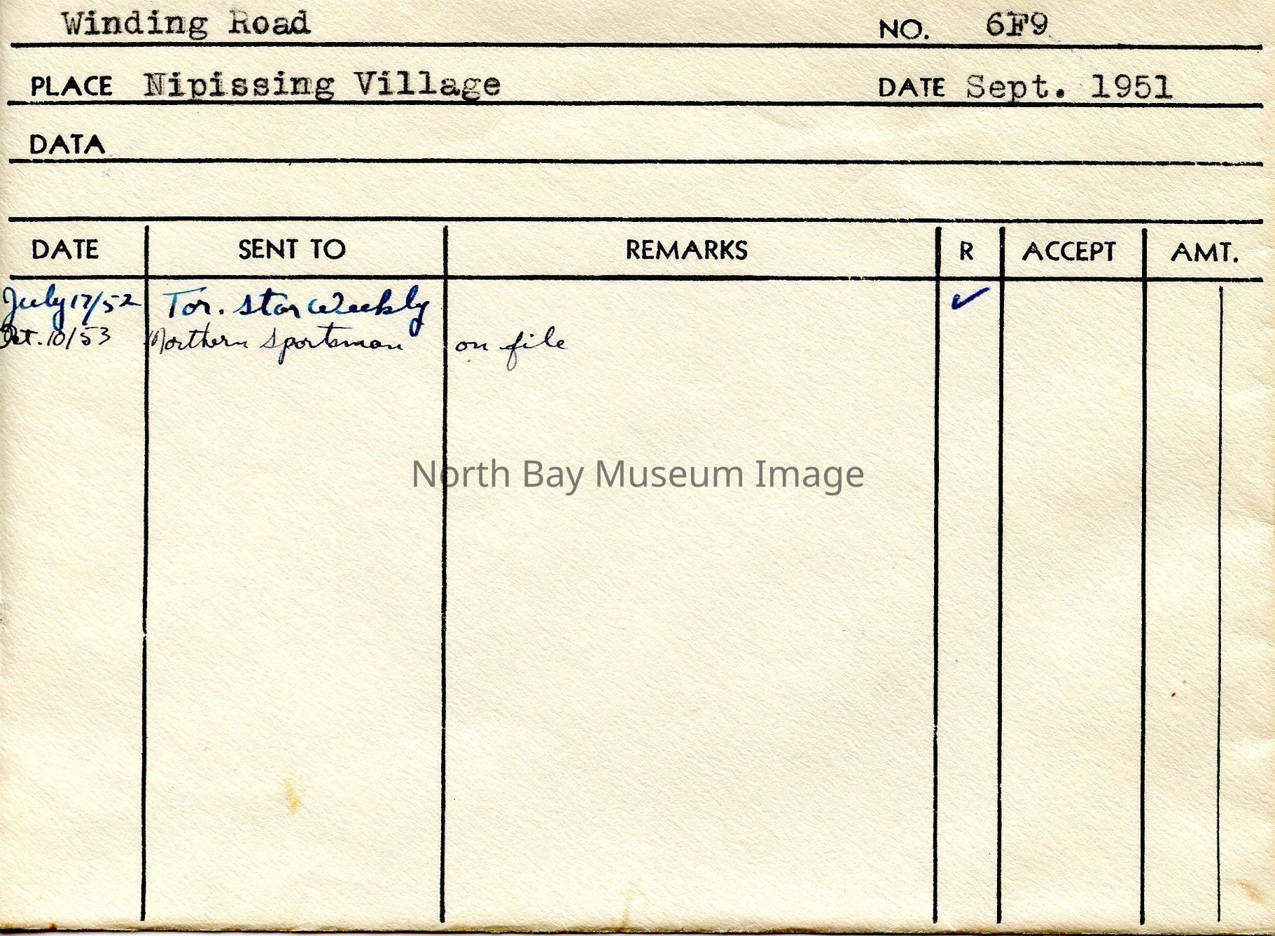 Envelope (a) contains the photographs and negatives (b-c) of a Winding road in Nipissing Village, North Bay. The image is of a old winding road early in the morning as the sun is rising. There is a group of individuals pictured in the photo who are crossing a small bridge on the winding road and two approaching behind to cross as well. A part of the Forder Collection. The photographers original accession number is 6F9. All the publications of the images are written on the envelopeCreator