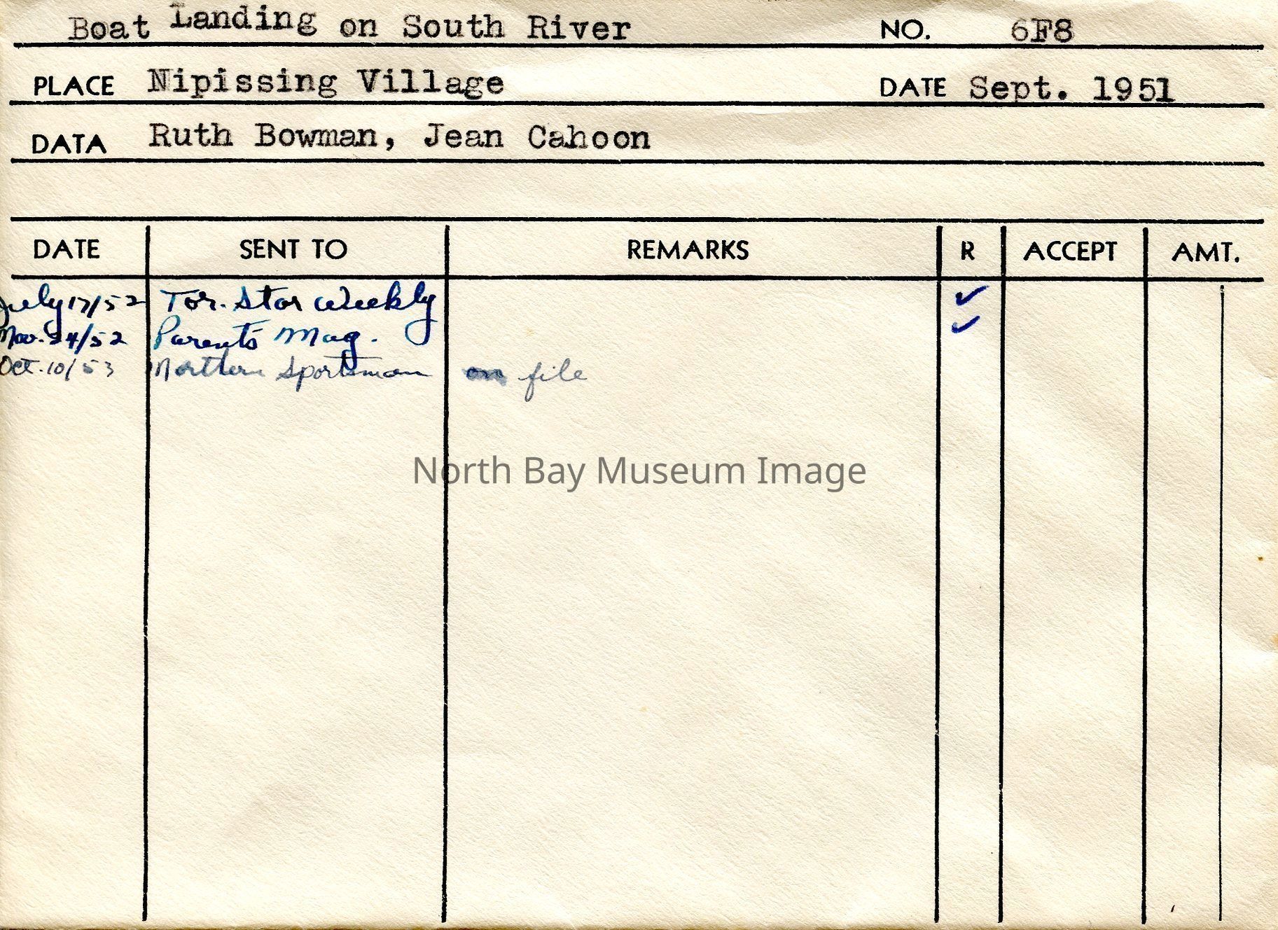 Envelope (a) contains the photographs and negatives (b-c) of a boat landing on south river. There are two women standing on the boat landing looking out at the water and scenary. A part of the Forder Collection. Names listed on the photograph are Ruth Bowman and Jean Cahoon.The photographers original accession number is 6F8. All the publications of the images are written on the envelope.Creator