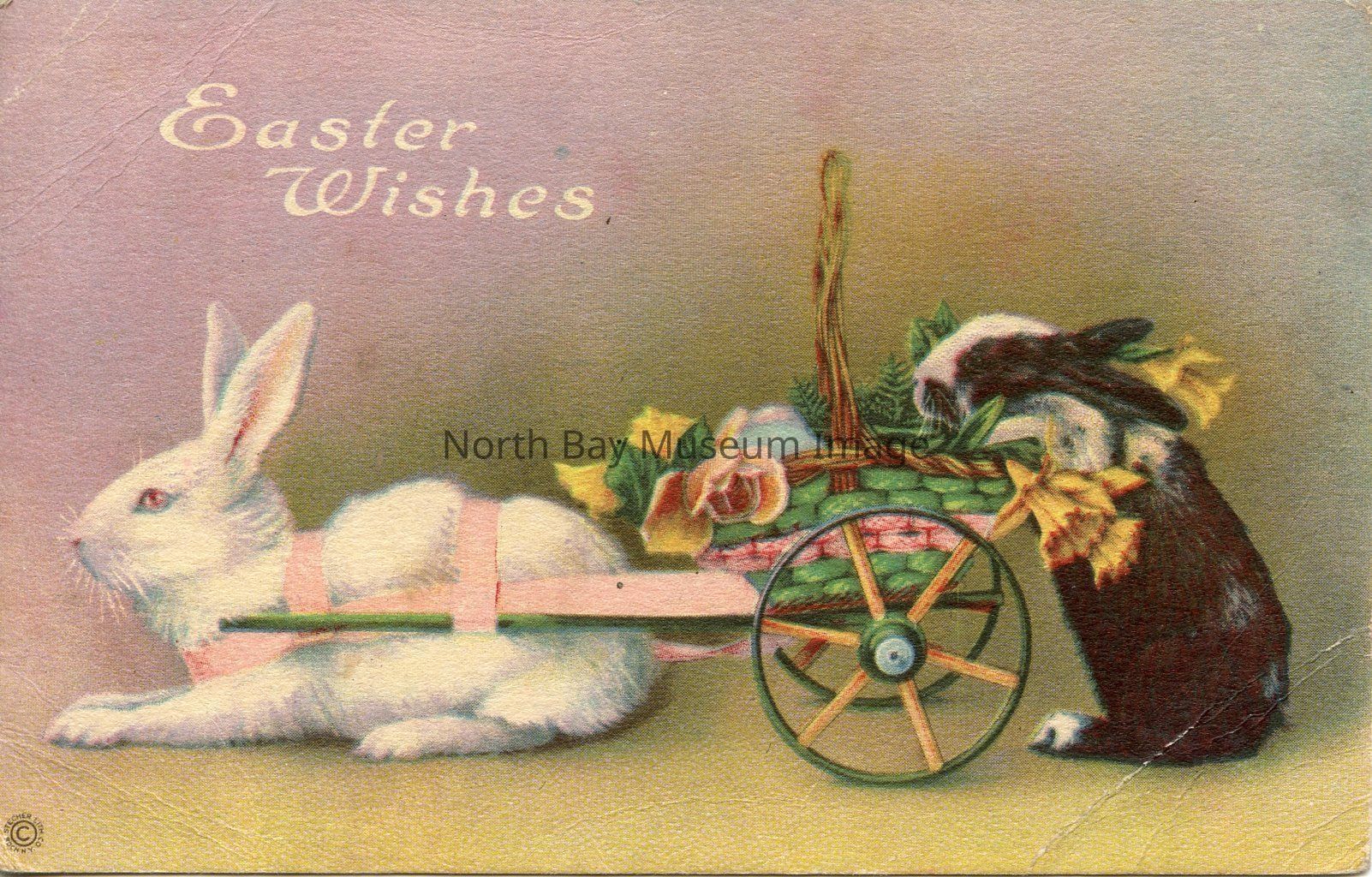 This is a coloured Easter postcard. The card has the white printed words "Easter Wishes" on left, top. In the picture there is an illustration of a white bunny lying down on ground. The bunny has a pink harness around it's neck and back pulling a green and pink fiber woven basket. The basket has a high handle. It is also mounted on large green spoked wheels with long arms secured to pink harness. There is also a black and white bunny sitting on its back legs holding onto the back of the basket filled with pink and yellow flowers, and green fern. In the lower left corner, the postcard logo can be seen.