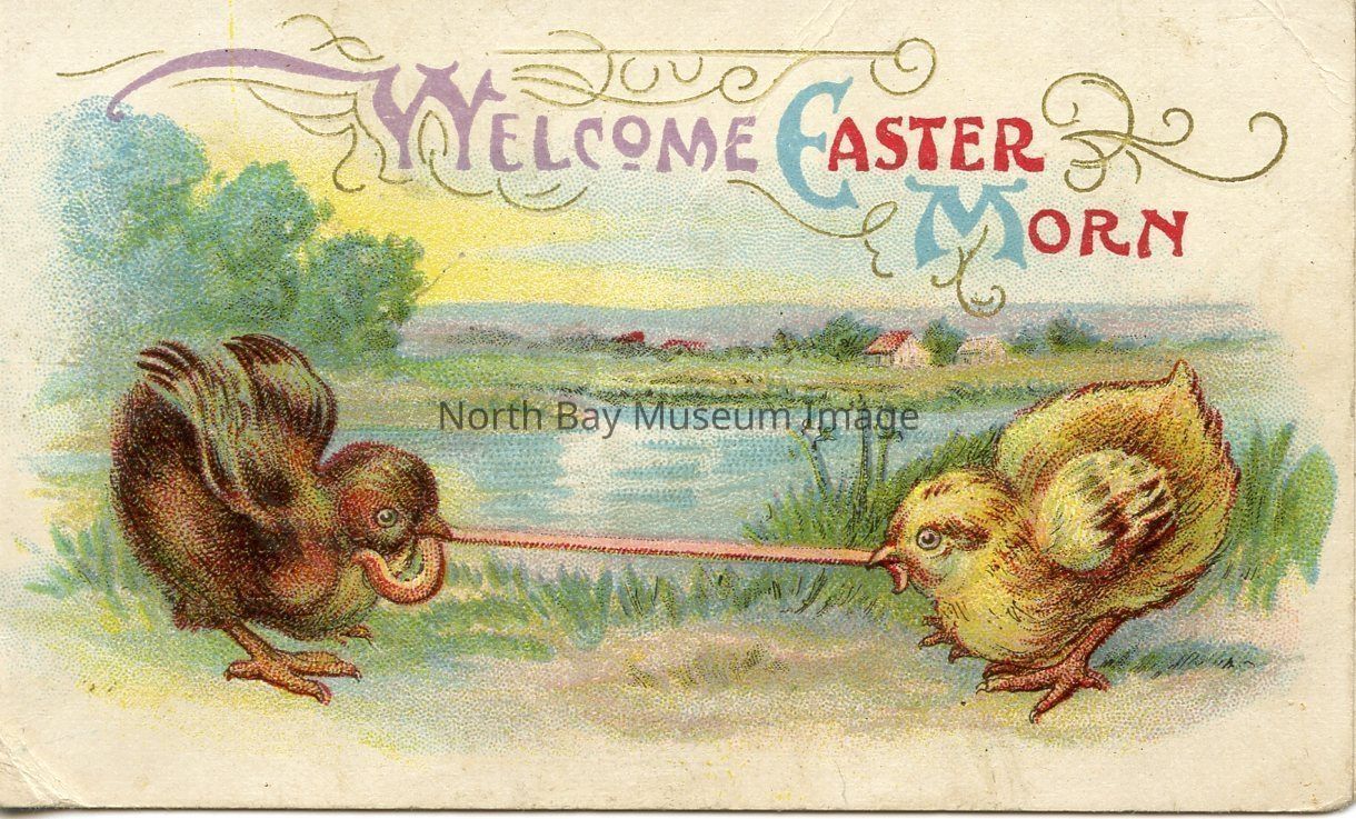 This is a small coloured, one fold card. There is a yellow and blue sky overlooking a river and flatground with small building in the distance.There is a large green tree on left bank of river. In the foreground there is a brown and yellow chicks fighting over a worm, among the tall green grass at edge of river. Printed in lavender, blue, and red letter is "Welcome Easter Morn." The card is framed by gold scrolls across top of the card.