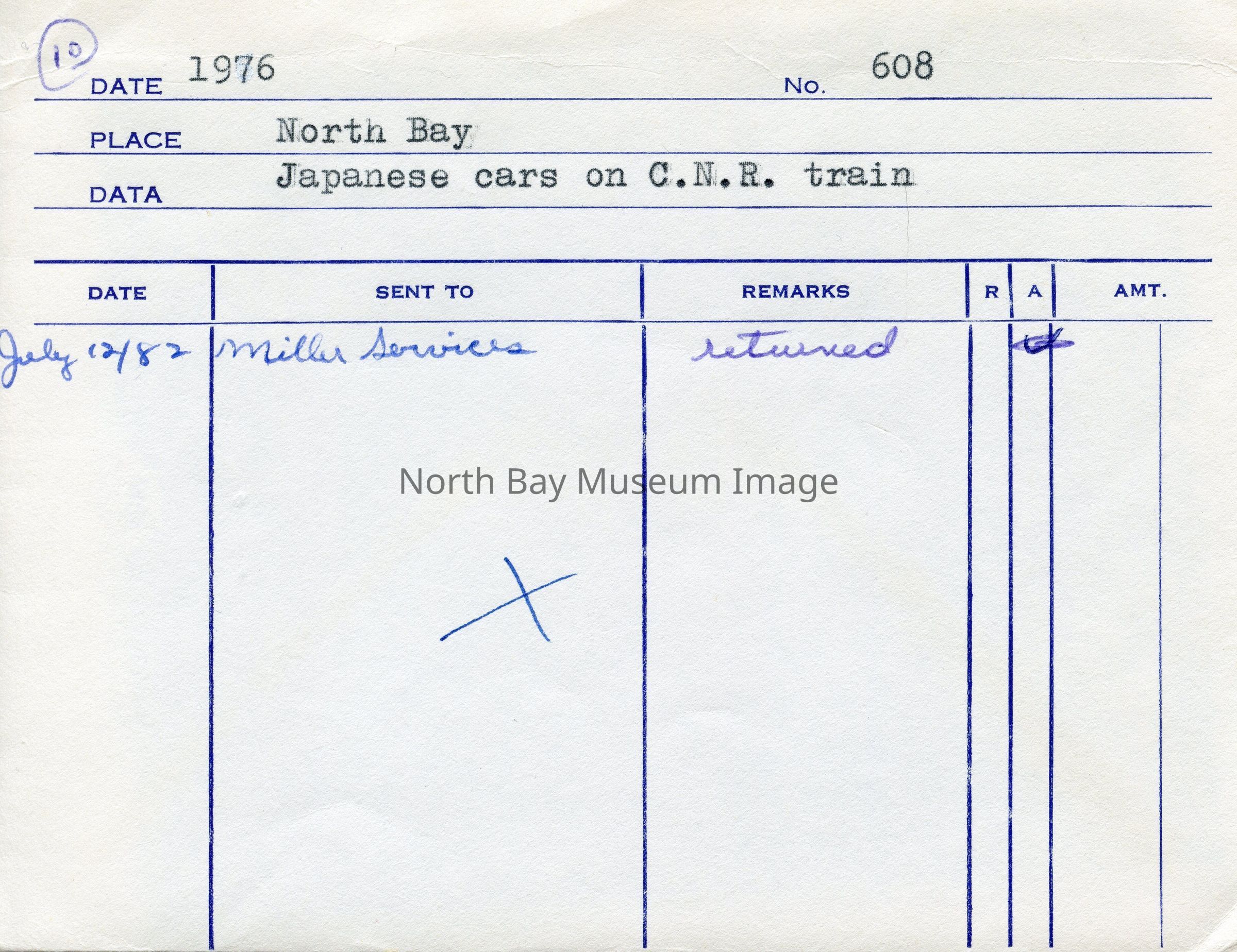 Inscriptions: "1976", "No. 608", "North Bay", "Japanese cars on C.N.R. train." Forder put the item(s) in this envelope, so contents have original order.