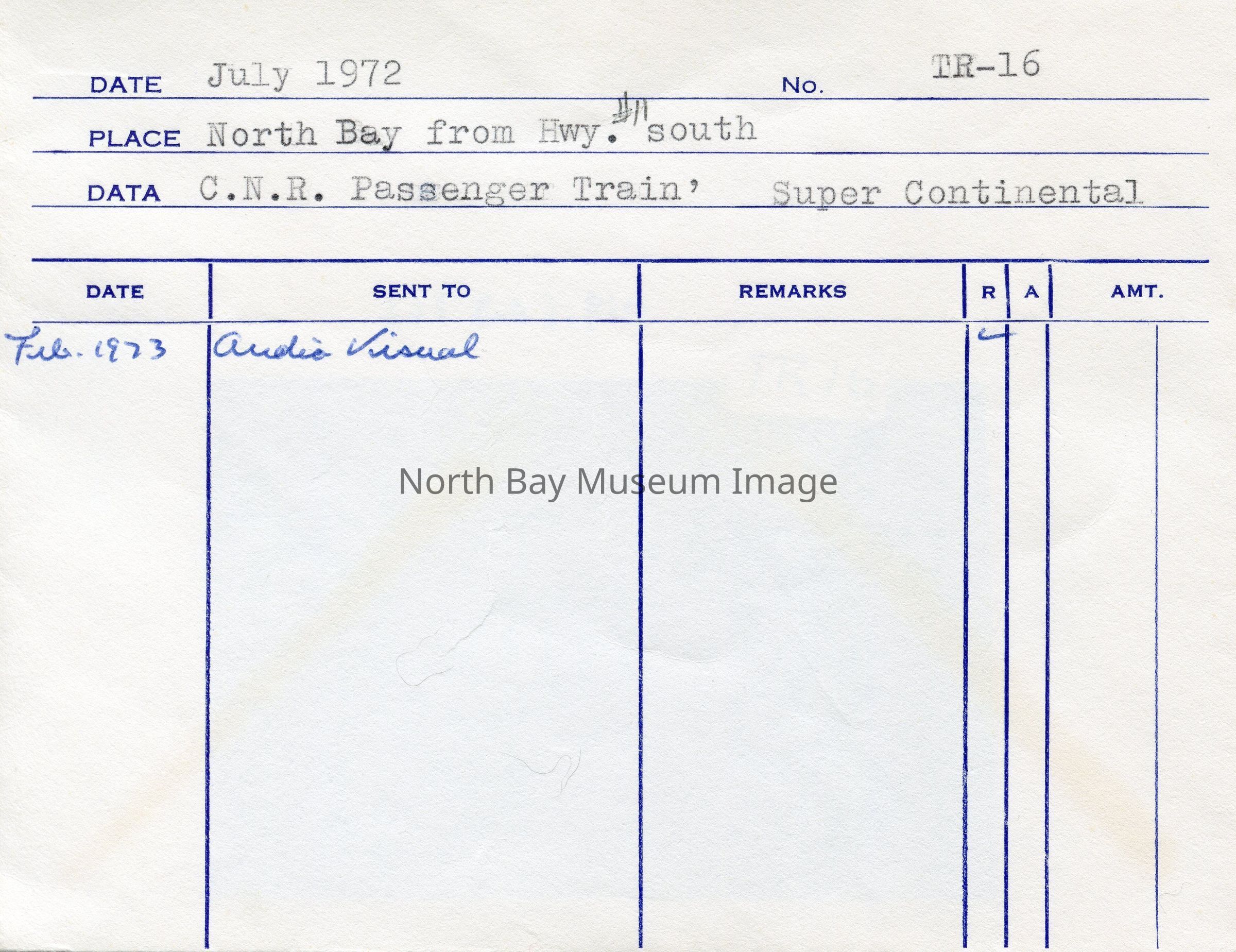 Inscriptions on envelope include: "July 1972", "TR-16", "North Bay from Hwy. #11 south", " C.N.R. passenger train'", "Super Continental." Forder put the item(s) in this envelope, so contents have original order.