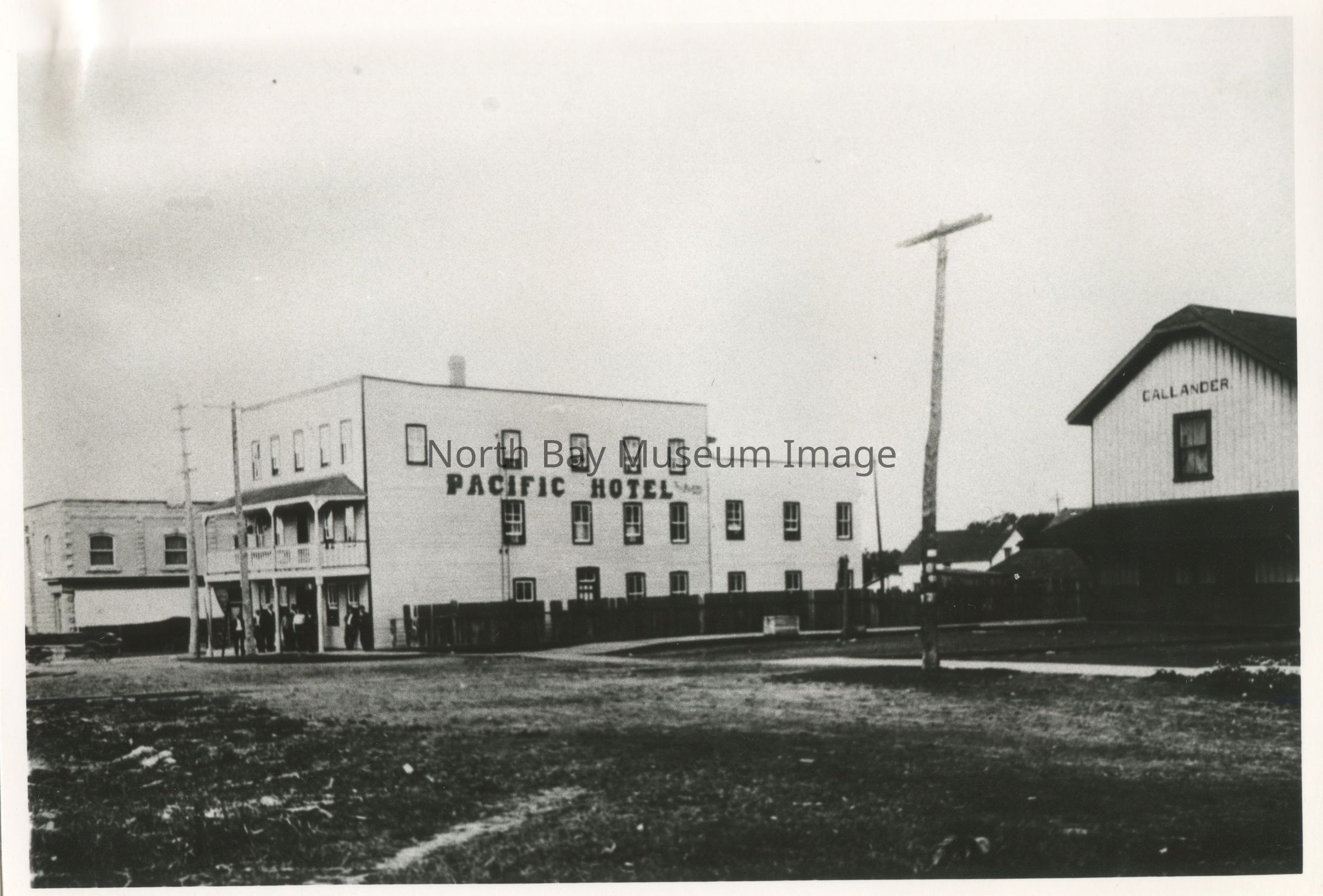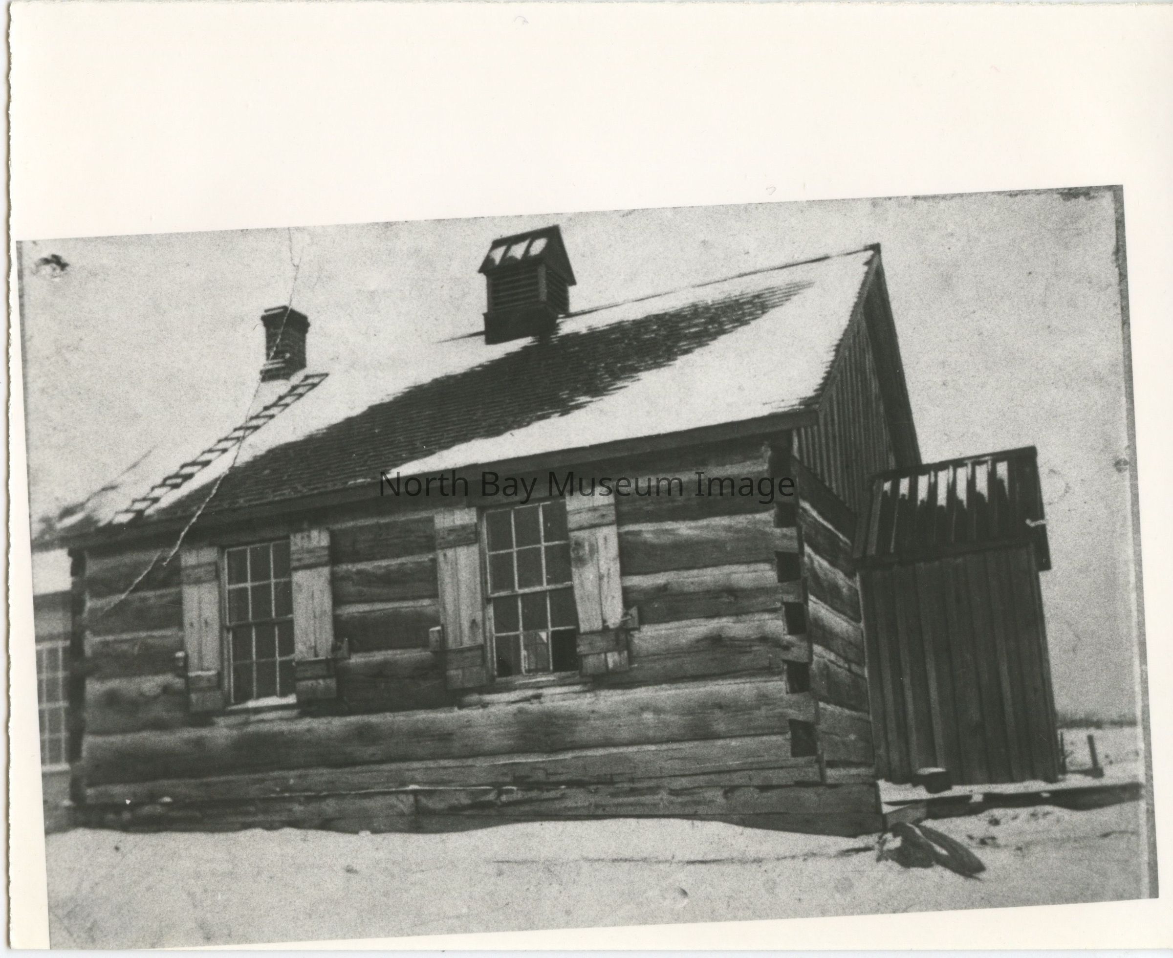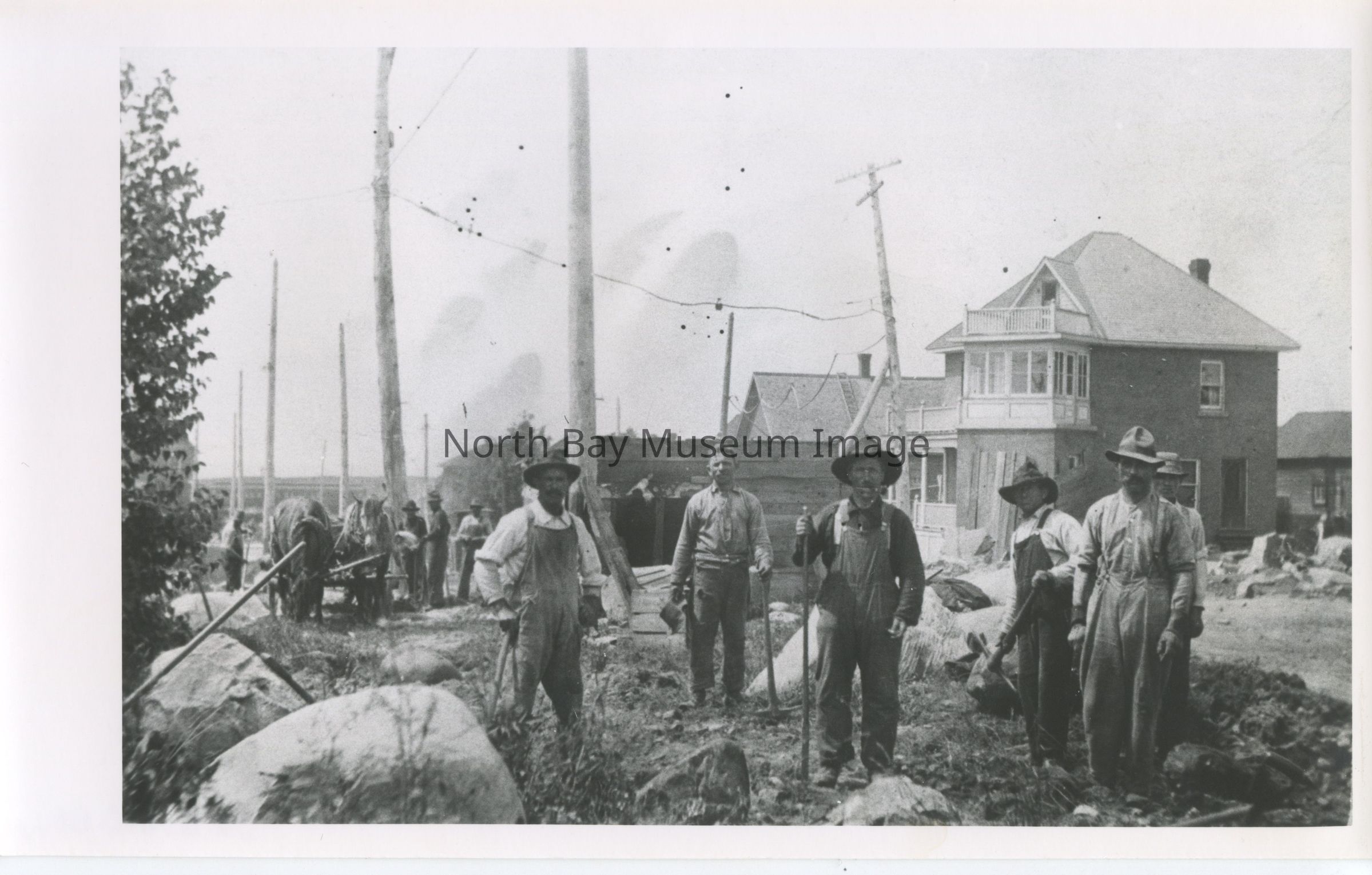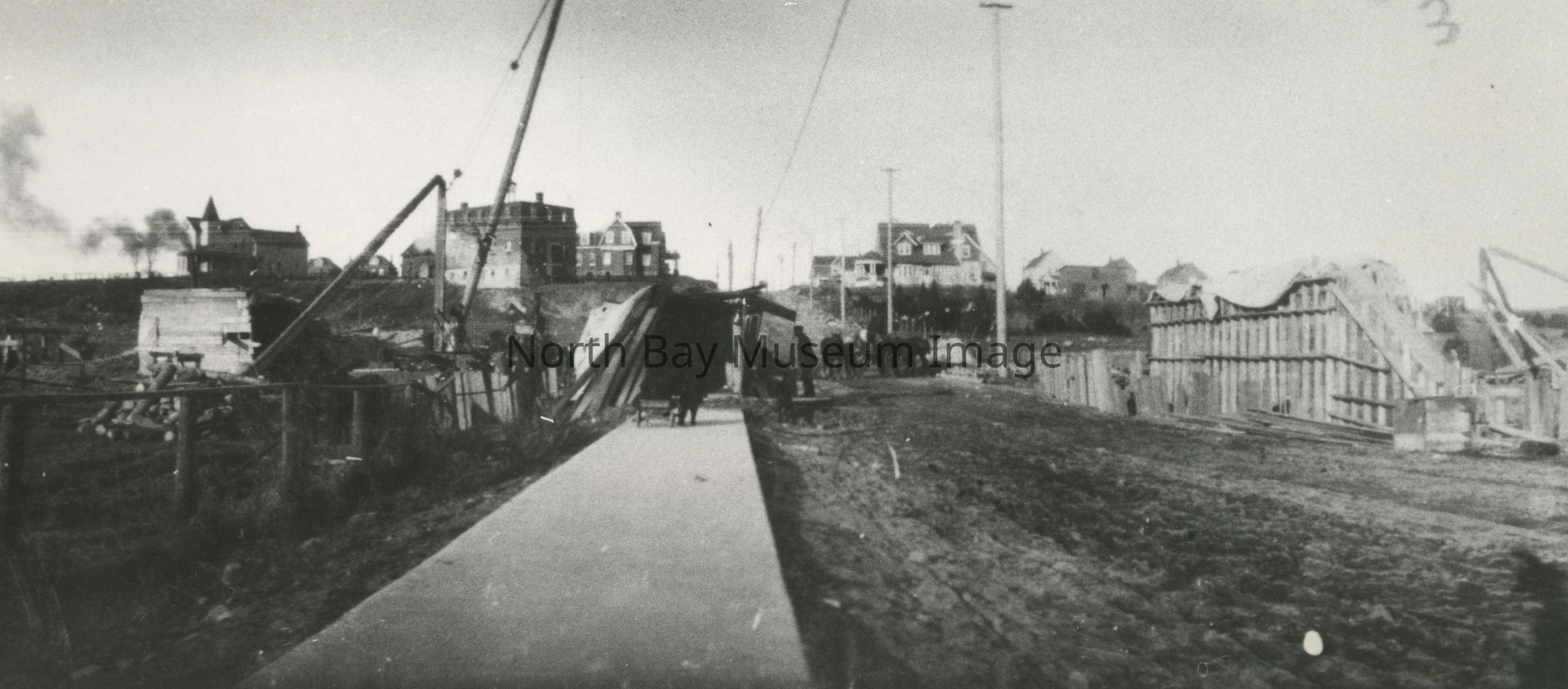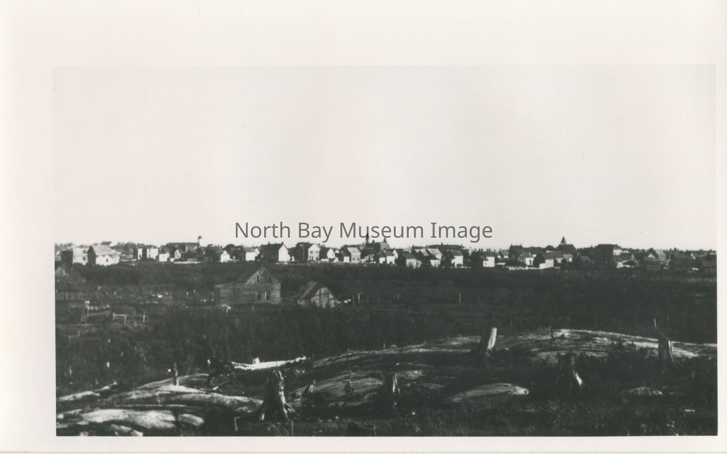 023.20.06x: View of residential area from a cliff. The person who took this original photo must have followed a rather rough trail to reach this location. It would have followed a path along what today is Wyld Street. In the foreground is a large rock formation with only moss, wild flowers, grass, and tree stumps. The 1900 photo shows the transformation of the landscape from verdant forest to burgeoning town in only 20 years. In the distance to the extreme left can be seen the steeple of St Mary of the Lake Catholic Church on Main Street (later the the site of the Cochrane Dunlop building, now the Block Public House). In the centre, on the corner of Ferguson and Main, across from the Queen’s Hotel (the present CIBC building), is the Ferguson building, identifiable by its twin towers. The building was destroyed in a fire in 1904 and with it burnt many of the town records. To the right can be seen the steeple of the Baptist Church on Main West, now an empty lot behind the Days Inn.