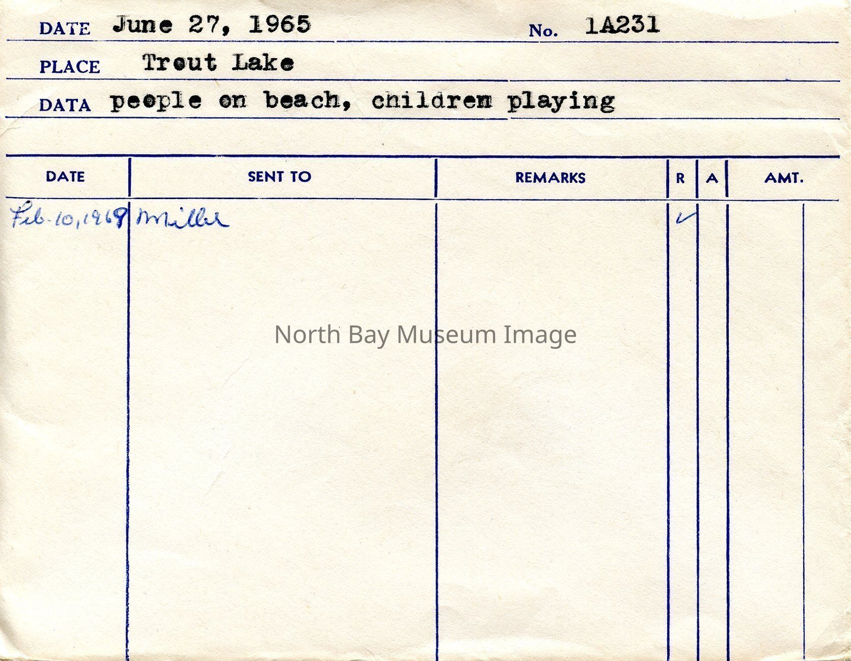 Photographer's Envelope (a) contains photographs and negatives (b-n) that captures various scenes of Trout Lake. Some images show people playing in the sand, and swimming in the water. As well as, lots of the images showcase a large amount of sun bathers at Trout Lake. Publications of the photo are listed on the back of the envelope.This image is a part of the Forder Collection.Creator