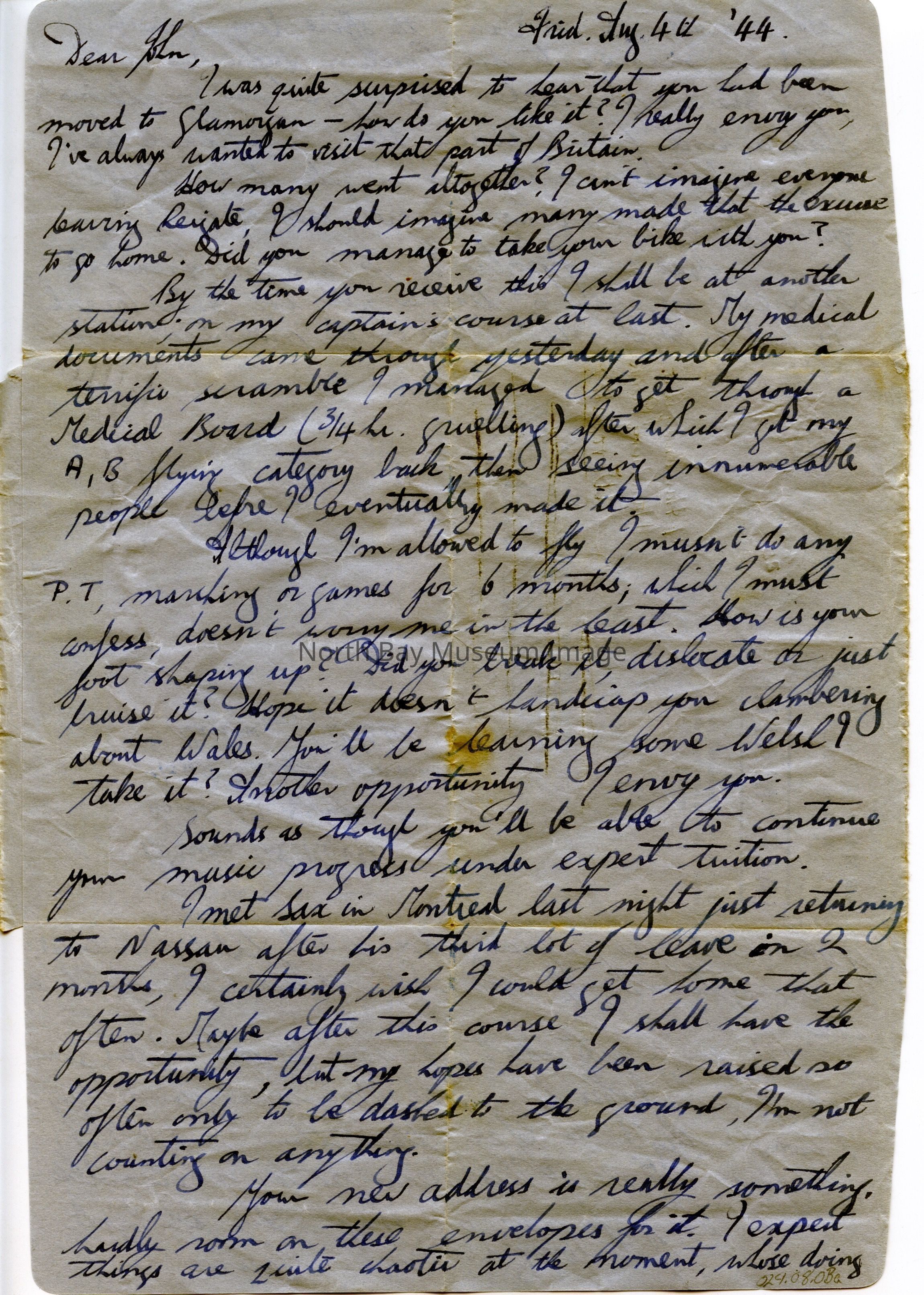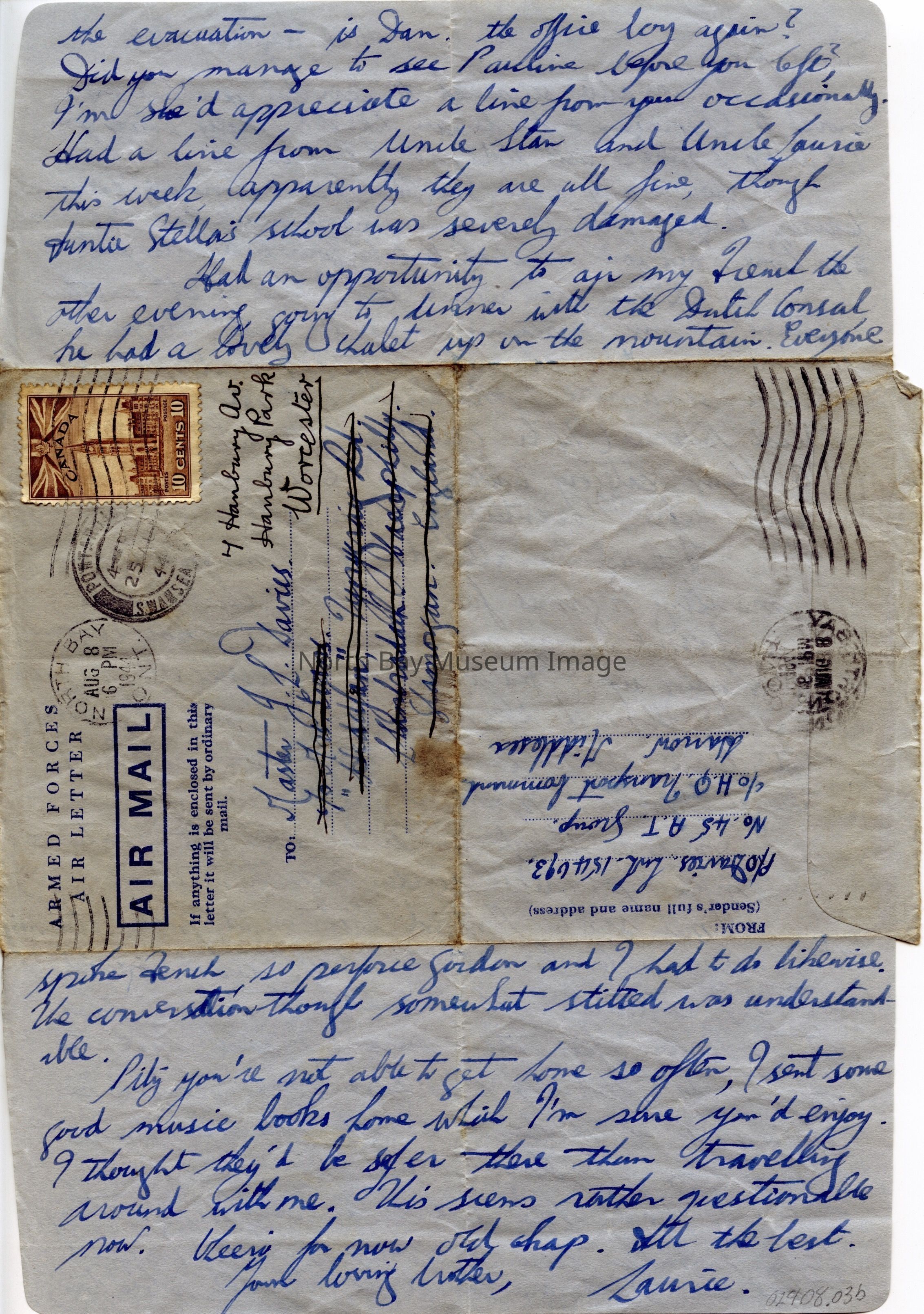 Frid. Aug 4th '44. On blue paper, Armed Forces Air Letter AIR MAIL (last two words in a box). Handwritten in blue ink. To Master J.L. Davies. Address of c/o Mrs. Evans, "Steddfan", Tynygraig Rd, Llanbradach, Caephilly, Glamorgan, England crossed out, replaced (in black ink) with 4 Hanbury Av., Hanbury Park, Worcester. From P/O Davies, LWL 154693, No. 45 A.T. Group, c/o H.Q. Transport Command, Harrow, Middlesex. Brown 10 cent Canadian stamp attached, except for lower left corner, showing Parliament Main Block.