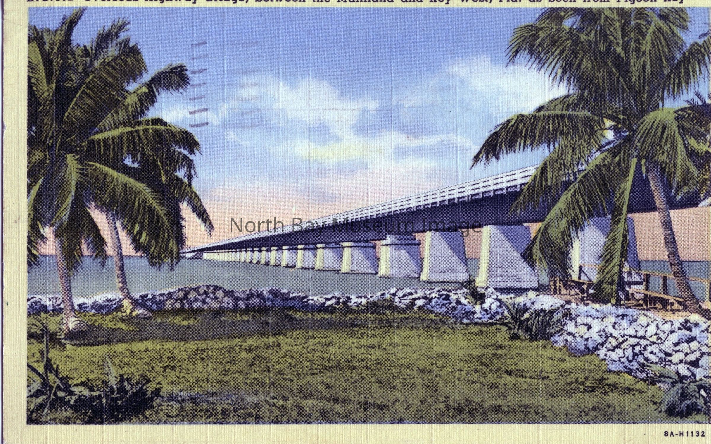 Colour, January 1944. Image of palm trees and long bridge over water. "D.C.132--Overseas Highway Bridge, between the Mainland and Key West, Fla. as Seen from Pigeon Key". POSTCARD BACK: Miami - Jan 30th '44. To Master J.L. Davies c/o Mrs. Kennet. Postmark Miami, Fla, Jan 31 0830 PM 1944.