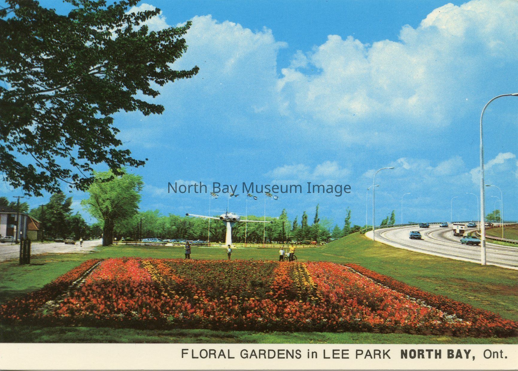 This Postcard shows the Floral Gardens in Lee Park, North Bay. Behind the red flowers is the CF plane. To the right of the flower bed is the highway. Located farther behind the CF plane is the Gateway Arch but it can not be seen in this image.