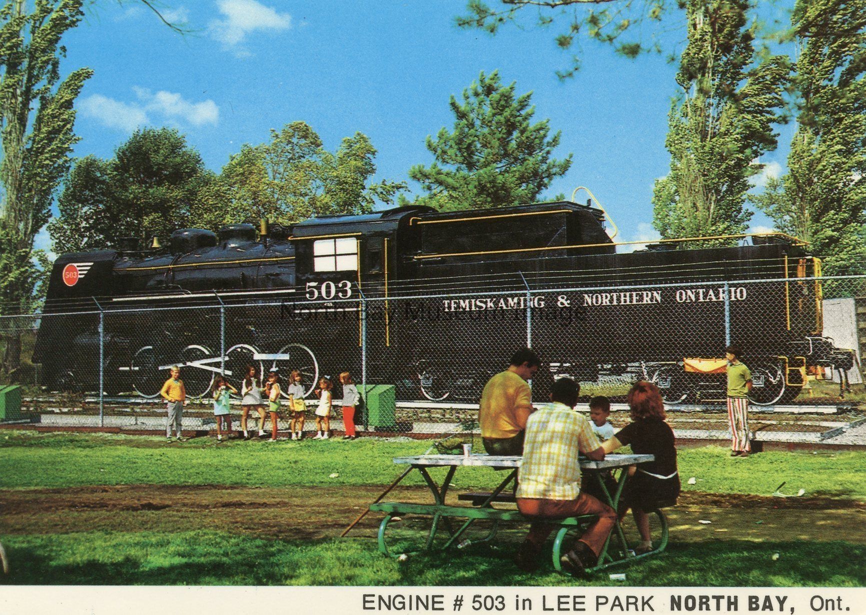 This postcard is of Engine # 503 in Lee Park, in North Bay. The image shows a family having a picnic in front of the 503. The 503 Engine is fenced in and there is a group of young children looking at the train.