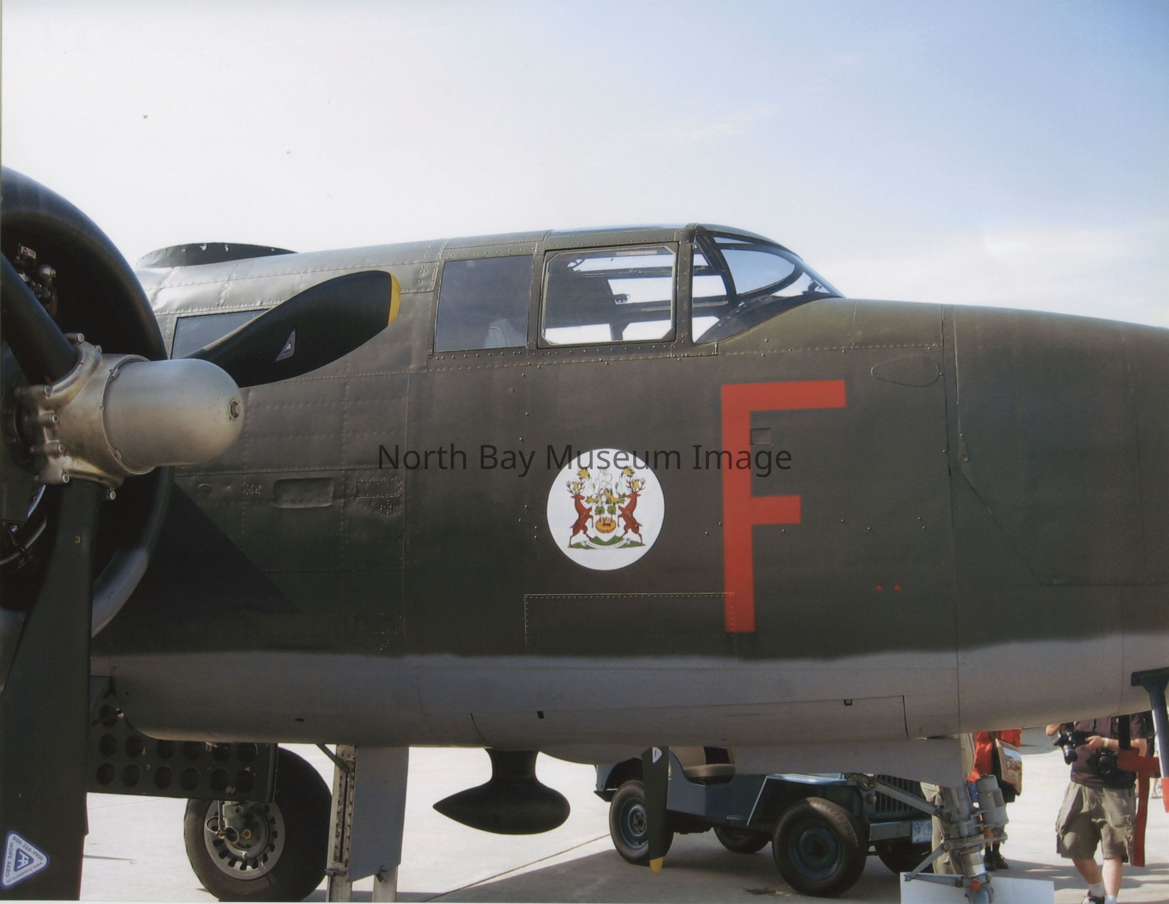 Colour, no date (modern). Close-up nose of WW2 B-25 bomber, olive drab paint top and sides, grey paint bottom, red F on side just below cockpit, to right of round white circle containing coat-of-arms. PHOTO BACK: blank. This was the type of airplane Flying Officer Davies was flying when he crashed, was kille