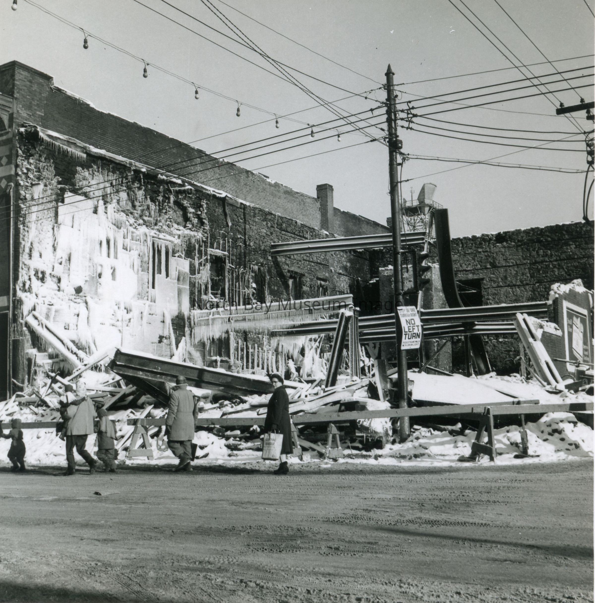 Negative (y) oversized, shows firemen standing next to pile of debris.