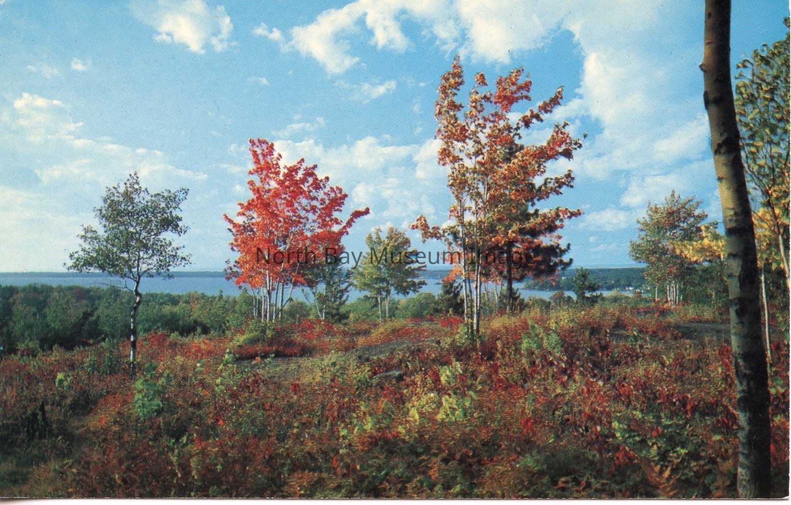This is a colourful postcard. This photo was taken in Autumn on the banks of beautiful Lake Nipissing in Northern Ontario. Considered to be "Canada's Vacationland." The photo looks out from a hill top at the tree landscape. All the trees are starting to change colour. In the background of the photo is the calm Lake Nipissing.