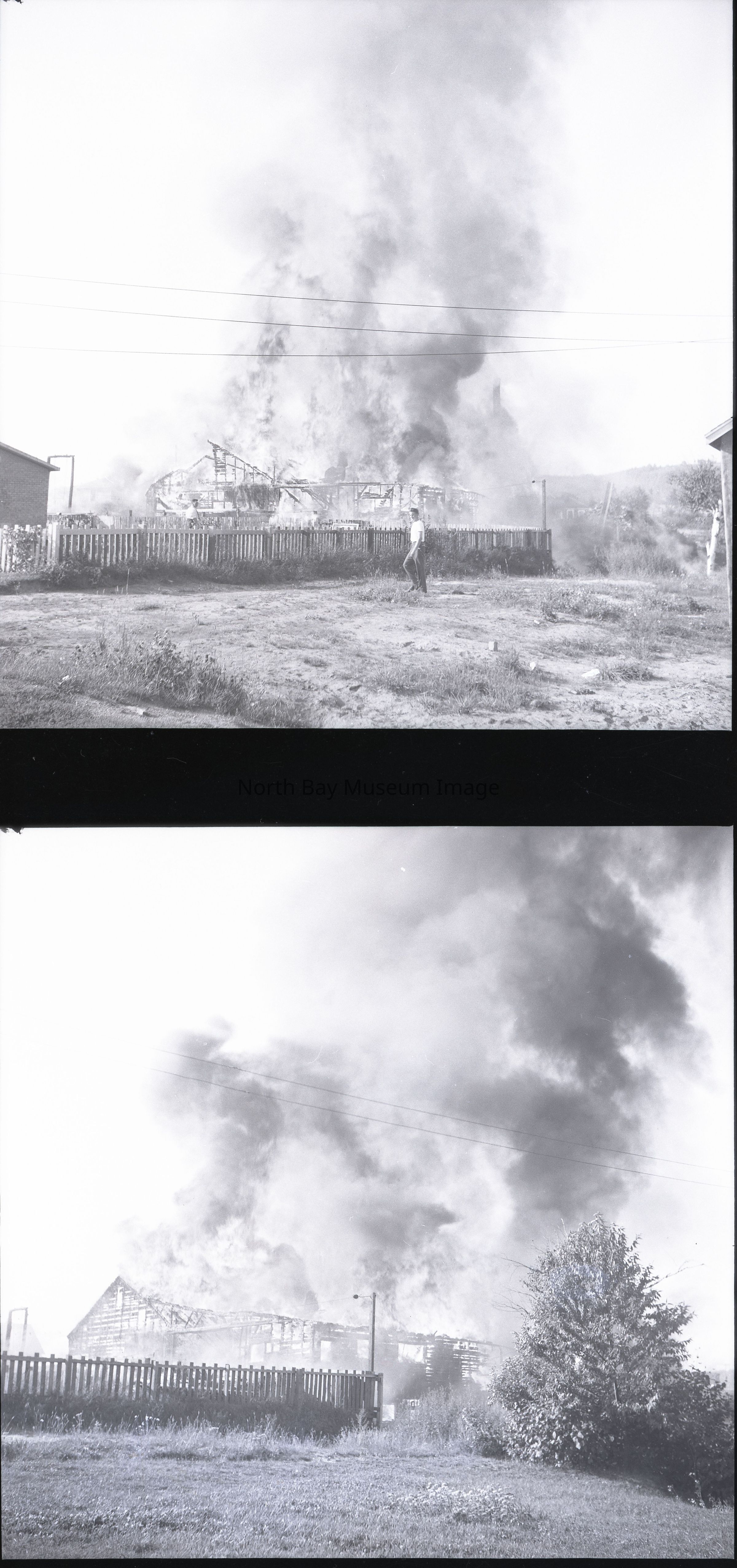 Envelope (a) contains the photographs and negatives (b-f) of a lumbermill fire at Schewe Lumbermill. Photographs are by William Forder with his notes on the envelope where negatives were kept. Negatives depict the structure from a distance with smoke rising taken from various angles. e- depicts a firefighter on the roof of the structure. F depicts a firefighter standing on the road spraying water at the building.