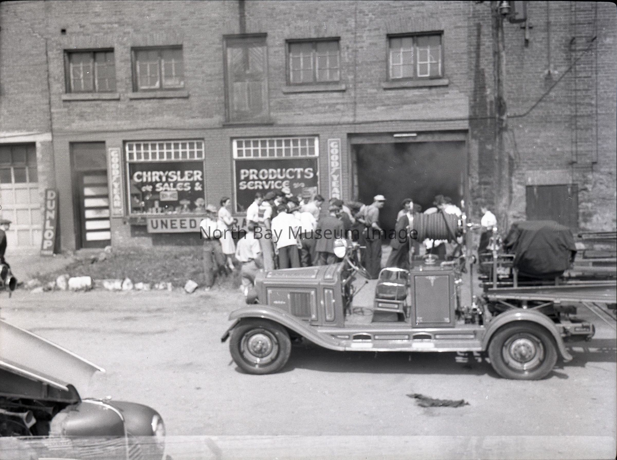 Envelope (a) contains the negatives (b-c) of a UNeedA Garage fire on Oak St. in North Bay August 1940. Negative b. is taken from across the street of the garage. You can see bystanders looking at the fire, as well as as see a fire truck putting out fire. Negative c. is taken from the same angle, except the bystanders are now on the fire side of the street all huddled around something unidentified. All the publications of the images are written on the envelopeCreator
