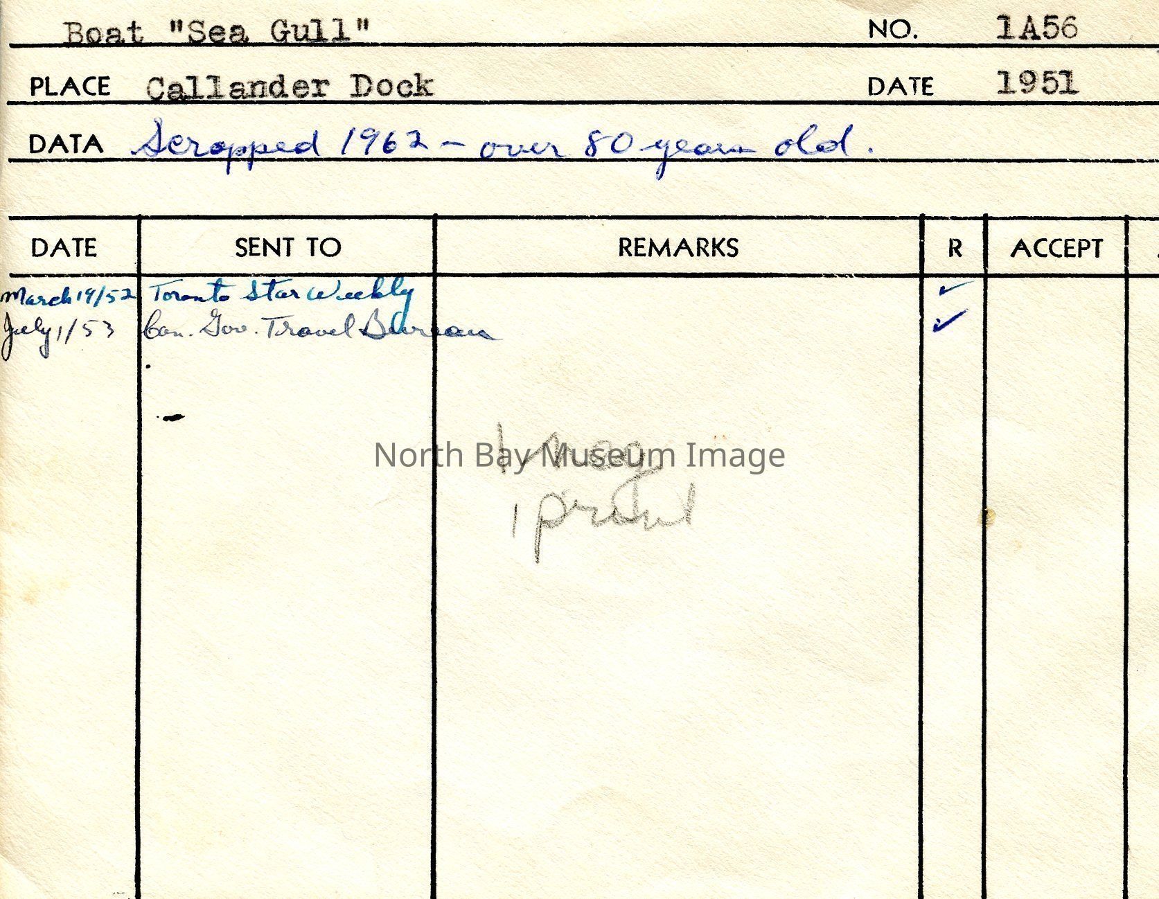 Photographer's Envelope (a) contains the photo and negative (b-c) of the Seagull. The image shows the boat on the background docked. There are also numerous sun bathers on the dock enjoying themselves. The Seagull would be scraped in 1962, being over 80 years old. The photographers original accession number is 1A56 for these images. This image is a part of the Forder Collection. The Publication dates and information for these images is listed on the envelope.Creator