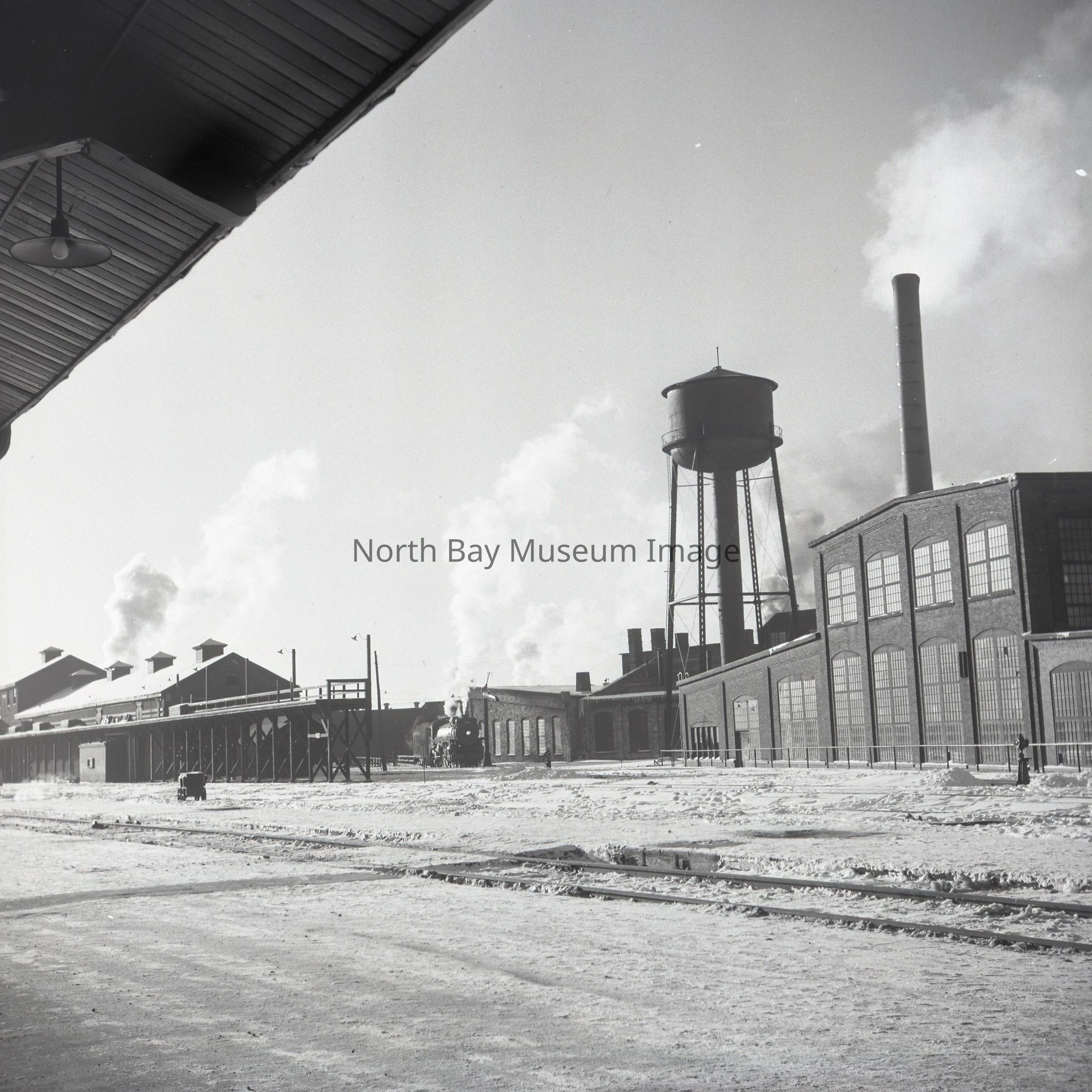 (a) is a photograph Envelope that was holding a negative. The envelope inscription (all of which are written in pen) reads: "C.P.R. Yard Scene", "11K15", "North Bay", "Jan. 1953", "Neg. Ice House, Water . Tank, Shops." All the publications are listed on the envelope. (b) is the negative. The negative is looking at all the amenities in the train yeard. There is small building, tall water tower. Most of the buildings have smoke coming from them. It appears to be winter in this image.Creator