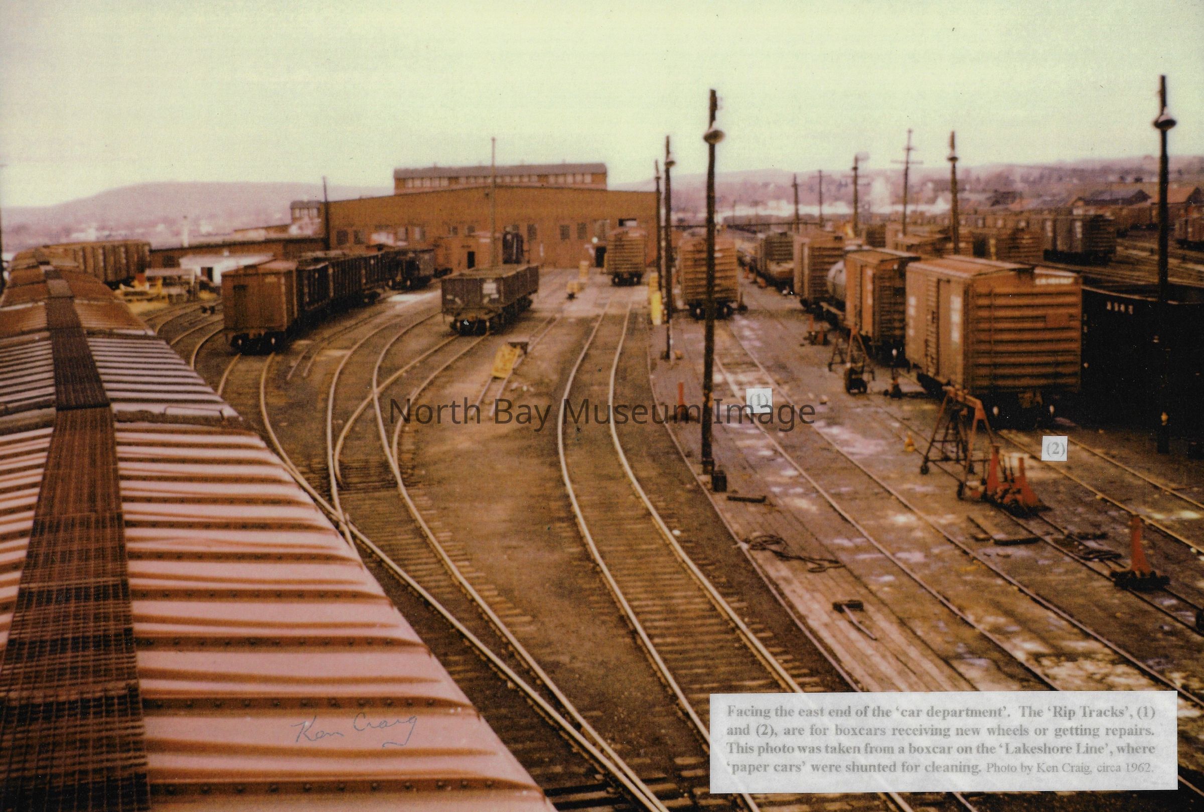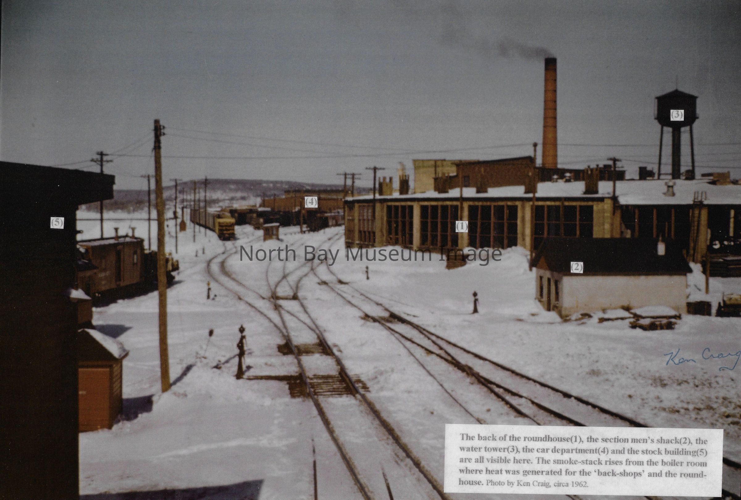 Series of photos by Ken Craig printed and laminated with captions explaining dates and photo captions. Not original photos, for reference of CPR North Bay buildings and yard from 1960-1990.