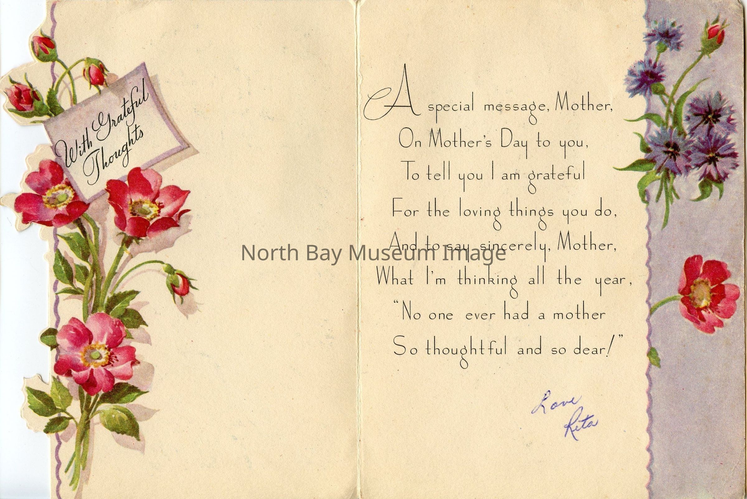 This is a Mother's Day card made by Rust Craft, Toronto, Canada. The card was printed in England. This card is from Rita. The front of the card is beige with colourful illustrations of flowers (that are red, and pink flowers) with a blue note on the top that says "A Mother's Day Message from your Daughter."The inside of the card has illustrations of colourful flowers. There is a small white card on the left hand side that says "With Grateful Thoughts." The right hand side of the message has a small message about Mother's Day. On the back there is a heart shaped image of a little cottage in the countryside. There is various types of flowers and vegetation growing in the countryside.
