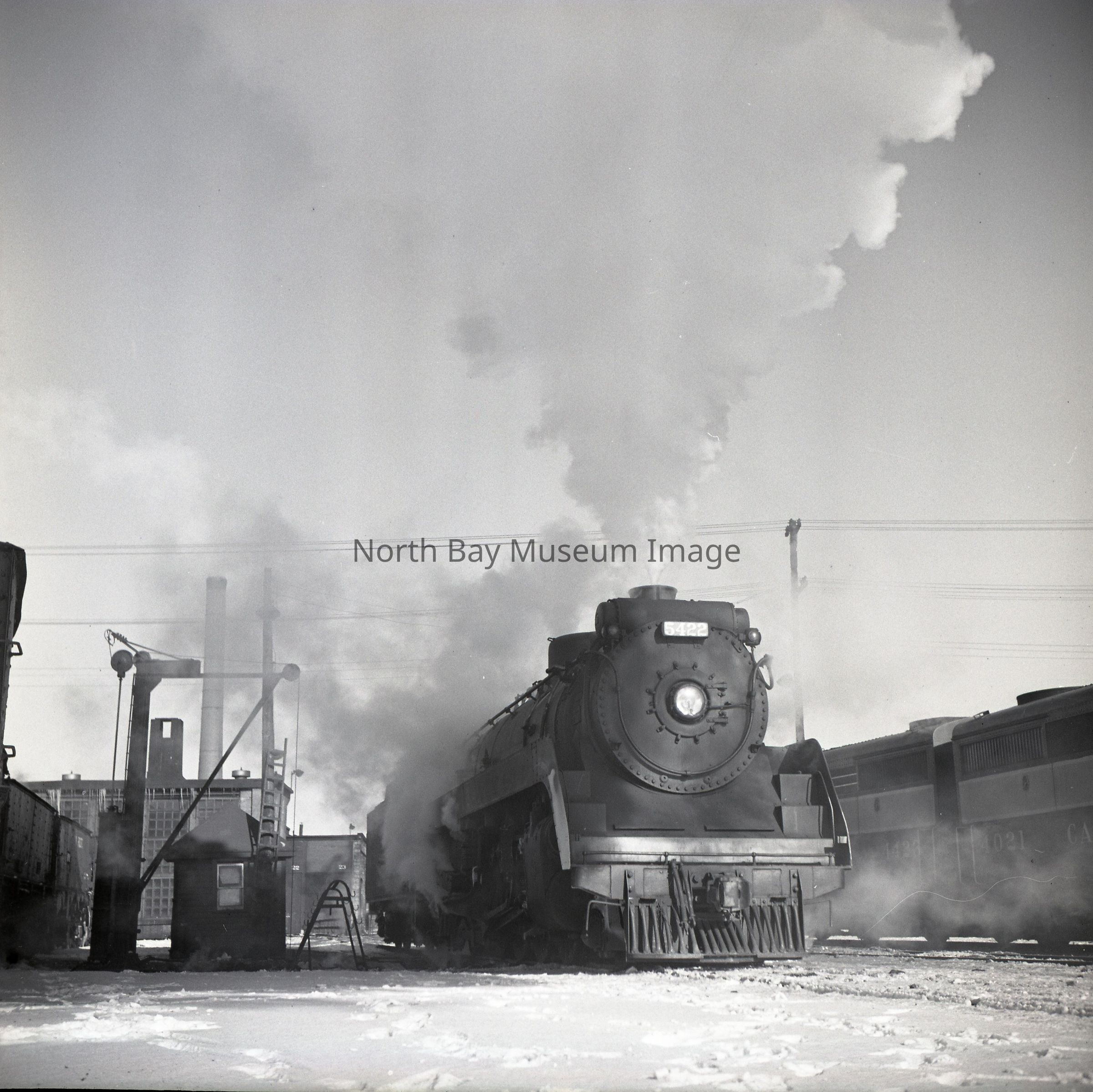 019.60.571a-c - Envelope, packet and negative. The envelope has the inscriptions "11K22. CPR Engine # 5422 at Ash Pit, North Bay, Ash Pit 1953." (c) is the photo of the CPR engine. The photo was taken from farther back. The engine appears to be stopped. There is a building on the right hand side of the photo. Note the large cloud of smoke coming from the train.Creator