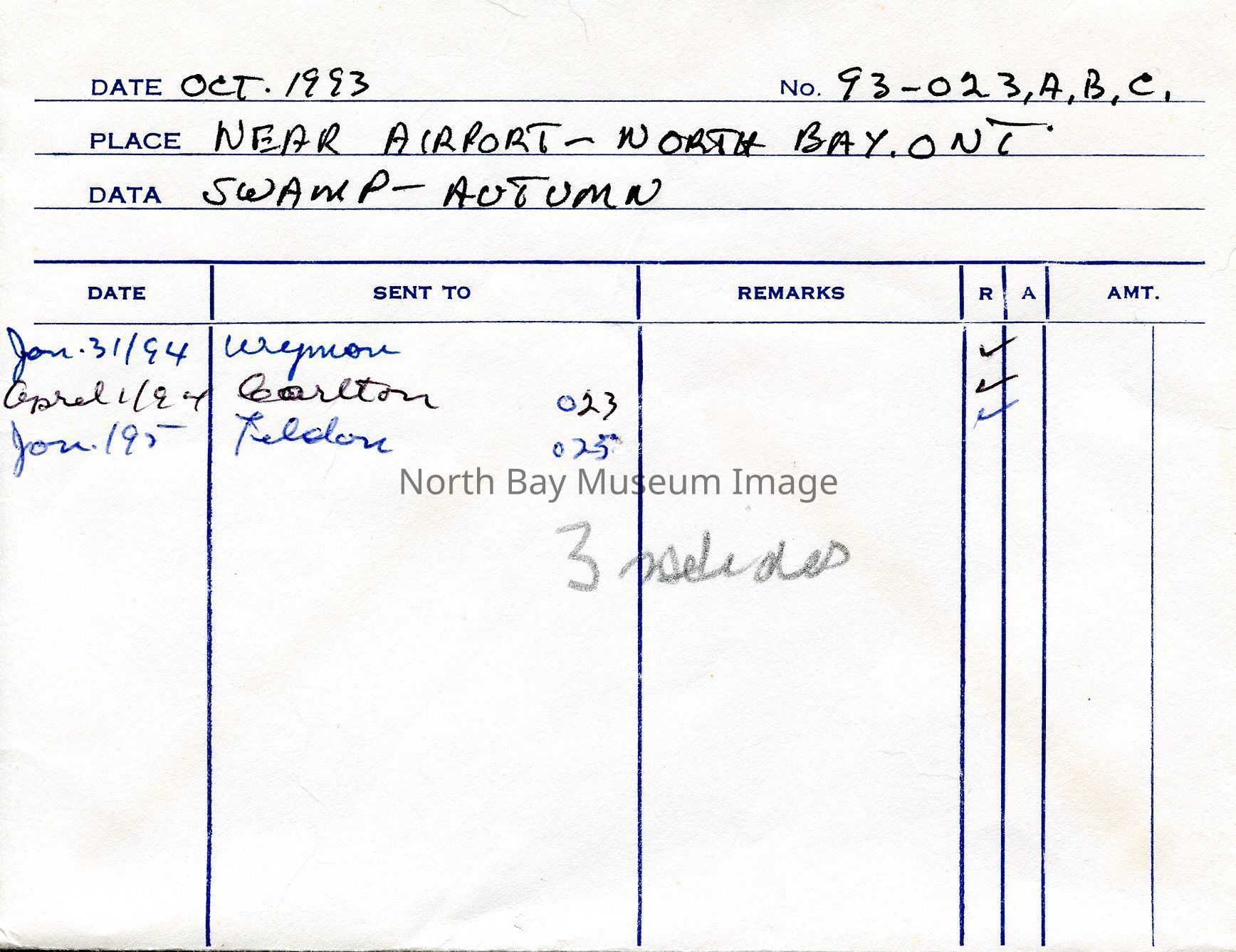 Envelope (a) containing slides (b-d) of a swamp in Autumn near Airport road in North Bay. Photo consists of nature shots of a swamp. The leaves are turning different colours and the water is calm. A part of the Forder Collection. Publication dates on the envelope. Photographers original number of photographs was 93-023.Creator