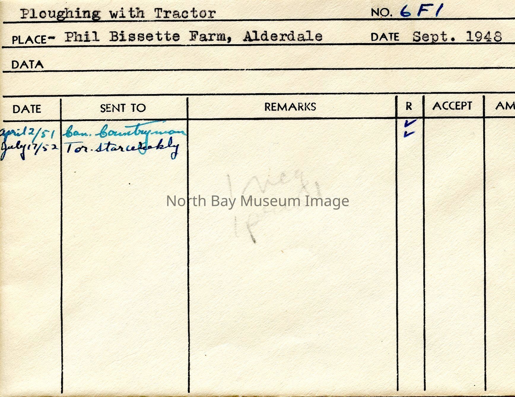 Envelope (a) containing photographs and negatives (b-c) of ploughing scene with tractor at Bissette Farm in Alderdale. Photo consists of a man ploughing the soil and a man on a tractor working the farm . A part of the Forder Collection. Photographers original number of photographs was 6F1. publications for photo on envelope.Creator