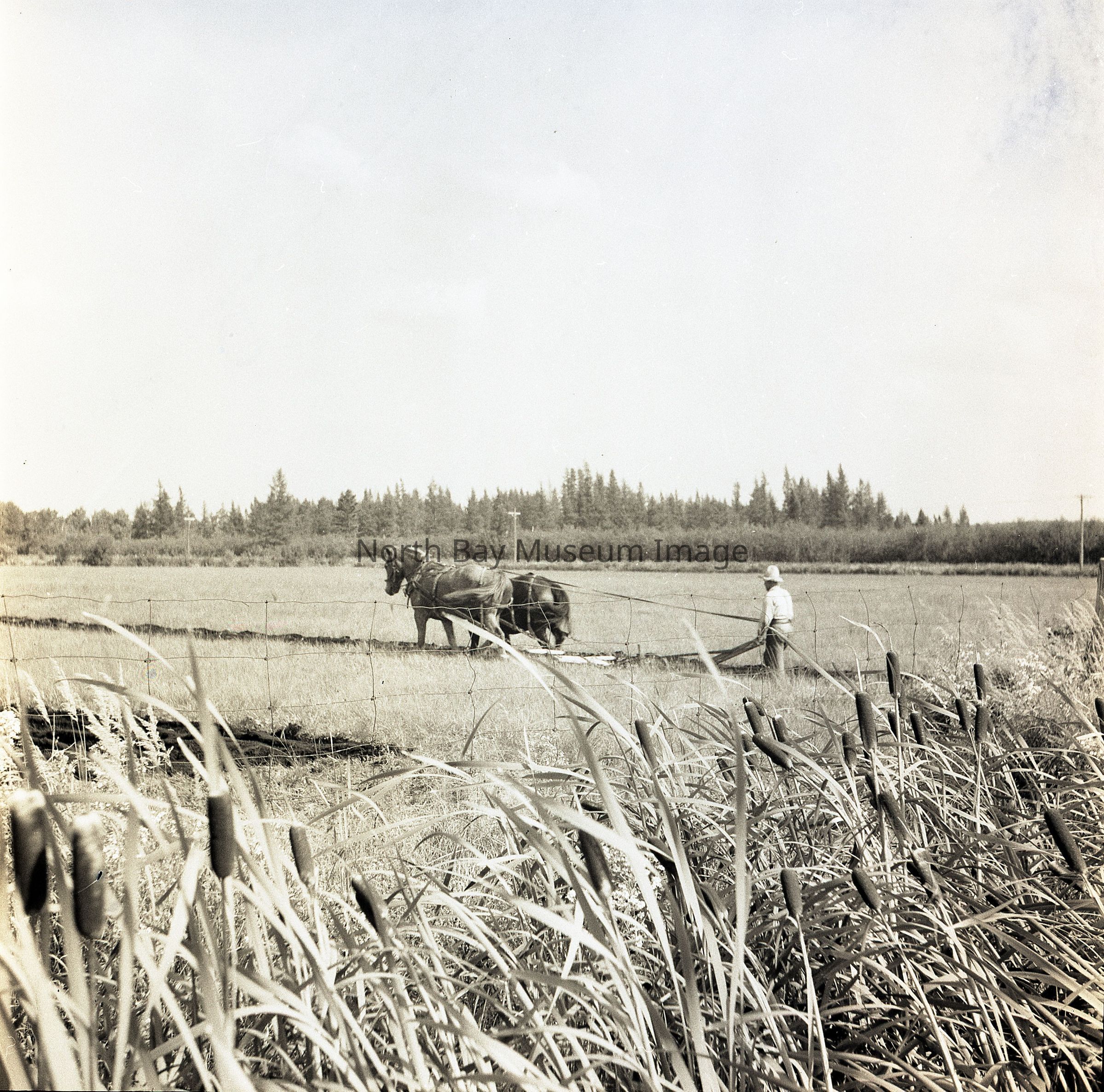 Envelope (a) containing photographs and negative (b-c) of fall ploughing scene with horse drawn tractor at Bissette Farm in Alderdale. Photo consists of a man ploughing the soil with a horse drawn plow in the fall time, on the farm . A part of the Forder Collection. Photographers original number of photographs was 6F2. publications for photo on envelope.Creator