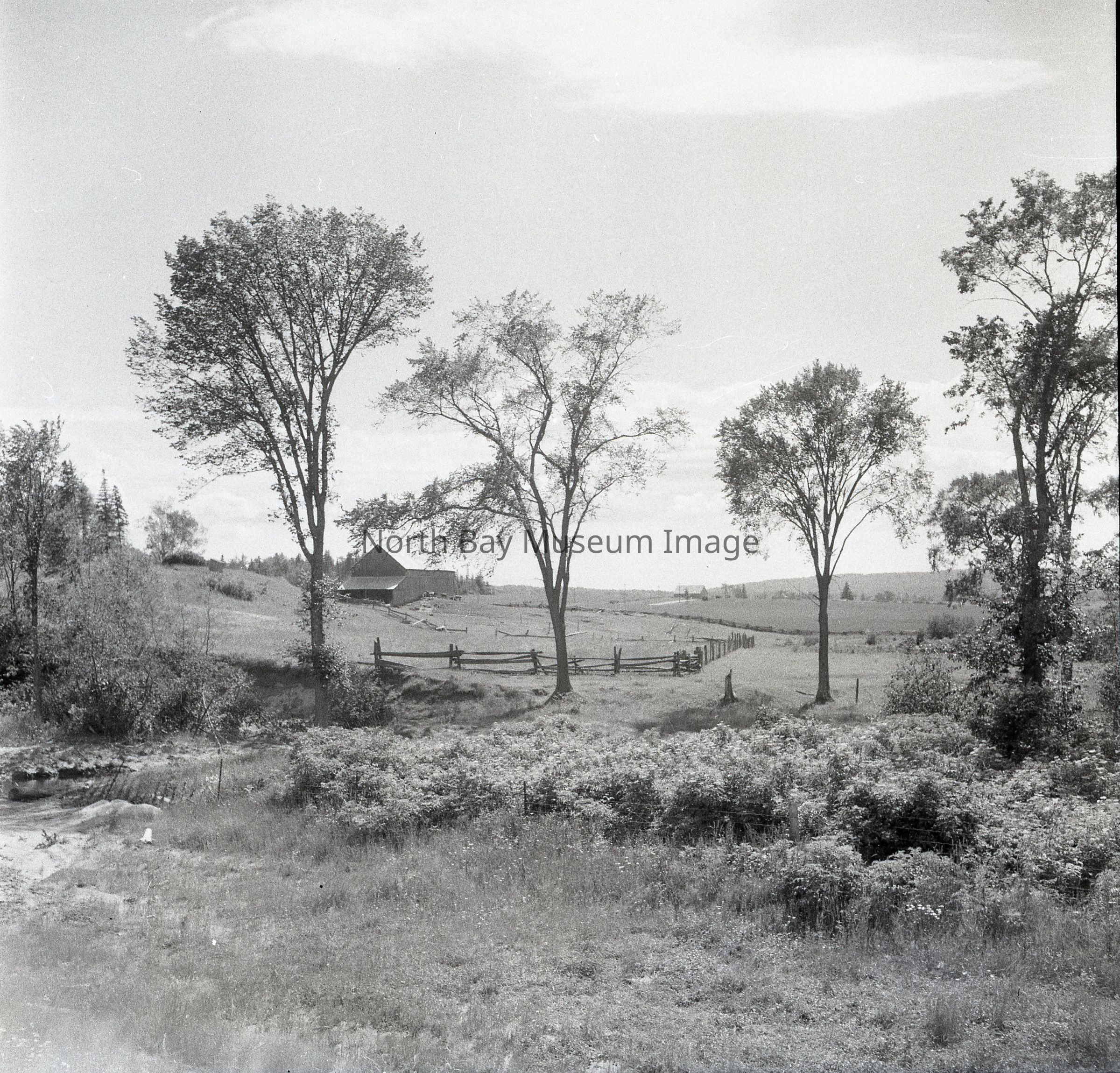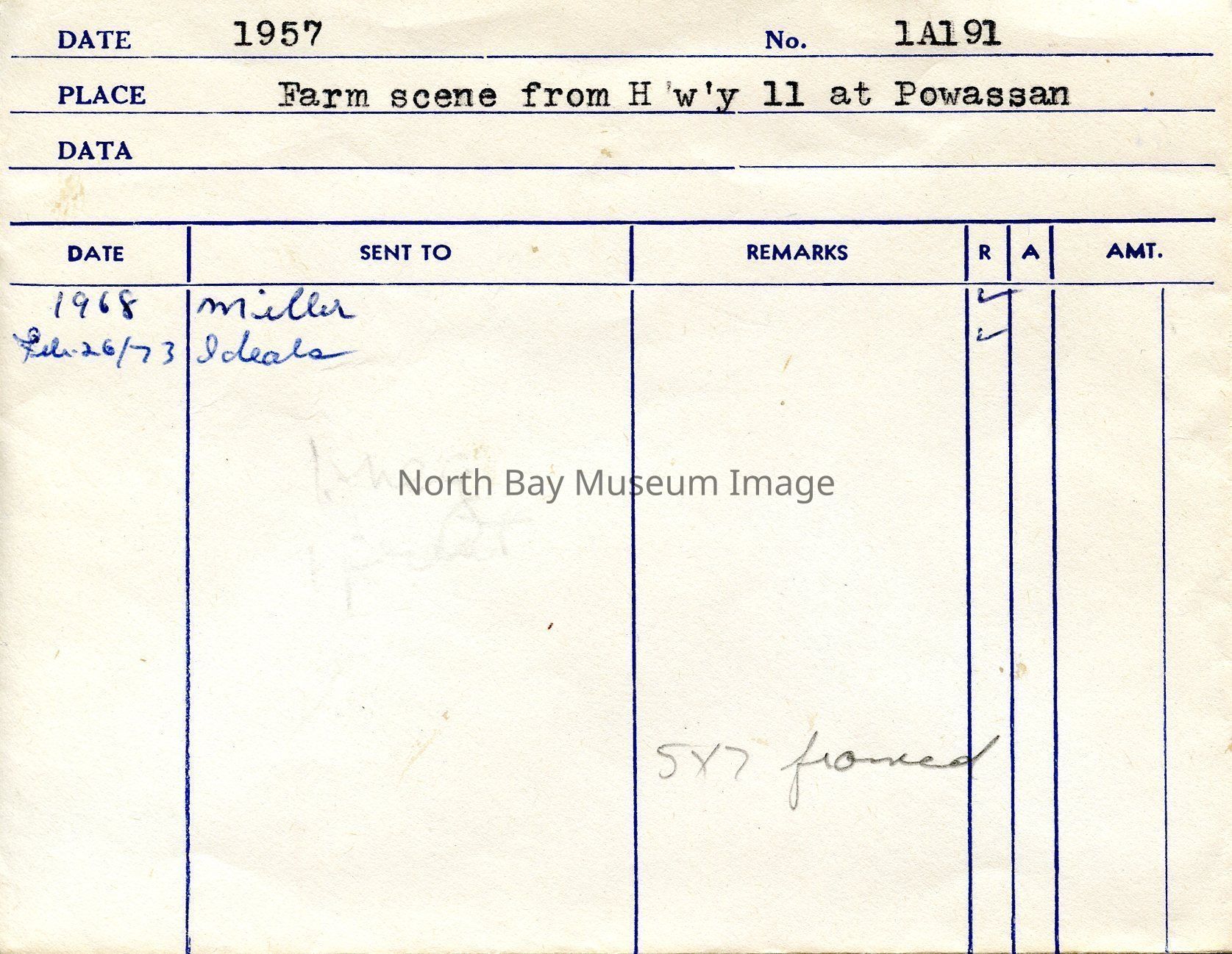 Envelope (a) containing photographs and negative (b-c) of a farm just off of HWY 11 near Powassan. Photo consists of a nature shot of the farm, including trees seperating the HWY from the farm, a barn and farmhouse are seen off in the distance . A part of the Forder Collection. Photographers original number of photographs was 1A191. publications for photo listed on envelope.Creator
