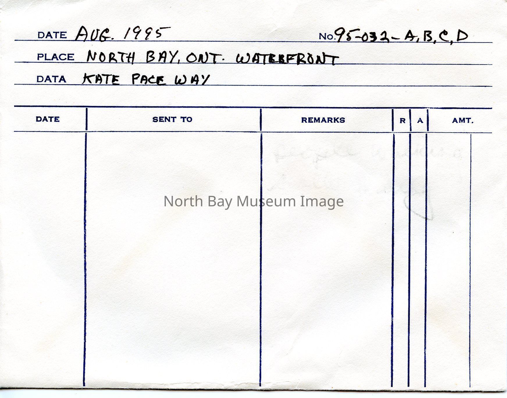 Envelope (a) containing negative (b-e) of North Bay Kate Pace Way by North Bay Waterfront. Photographer William Forder's original number was 95-032