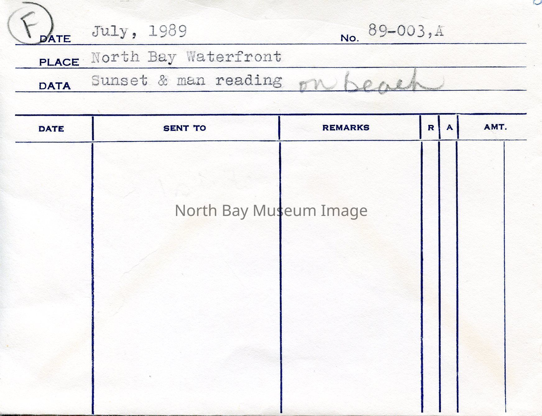 Envelope (a) containing negative (b) of a sunset and a man reading on a beach . Photo shows a man in the distance reading a book on the beach while the sunsets. Photographer William Forder's original number was 89-003.Creator
