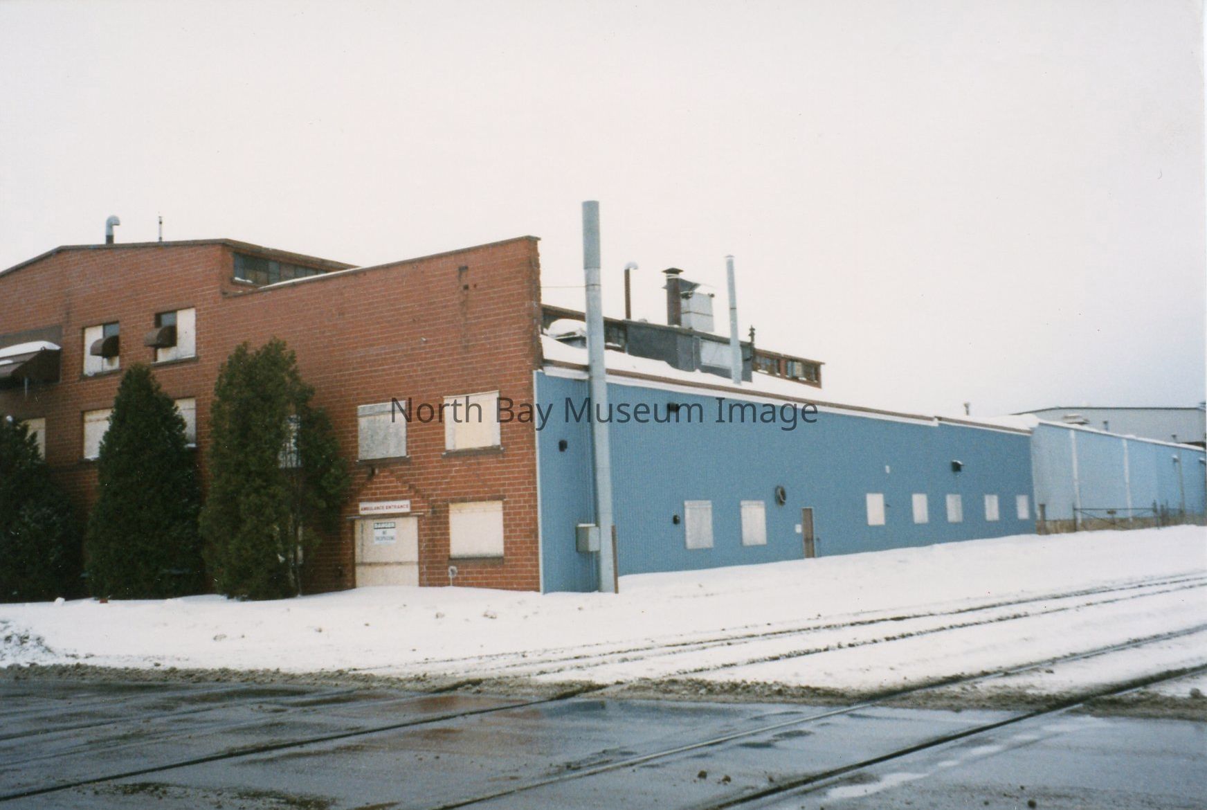 - A- is right corner view from rail tracks at Memorial Drive. Side of building is blue. Front is brown brick.