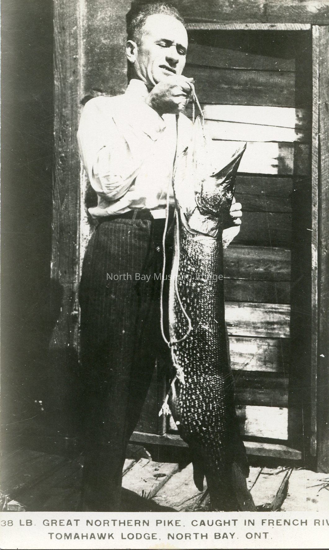 Black and white photograph postcard with caption under photo reads: 38 LB. Great Northern Pike Caught in French River Tomahawk Lodge, North Bay, Ont.