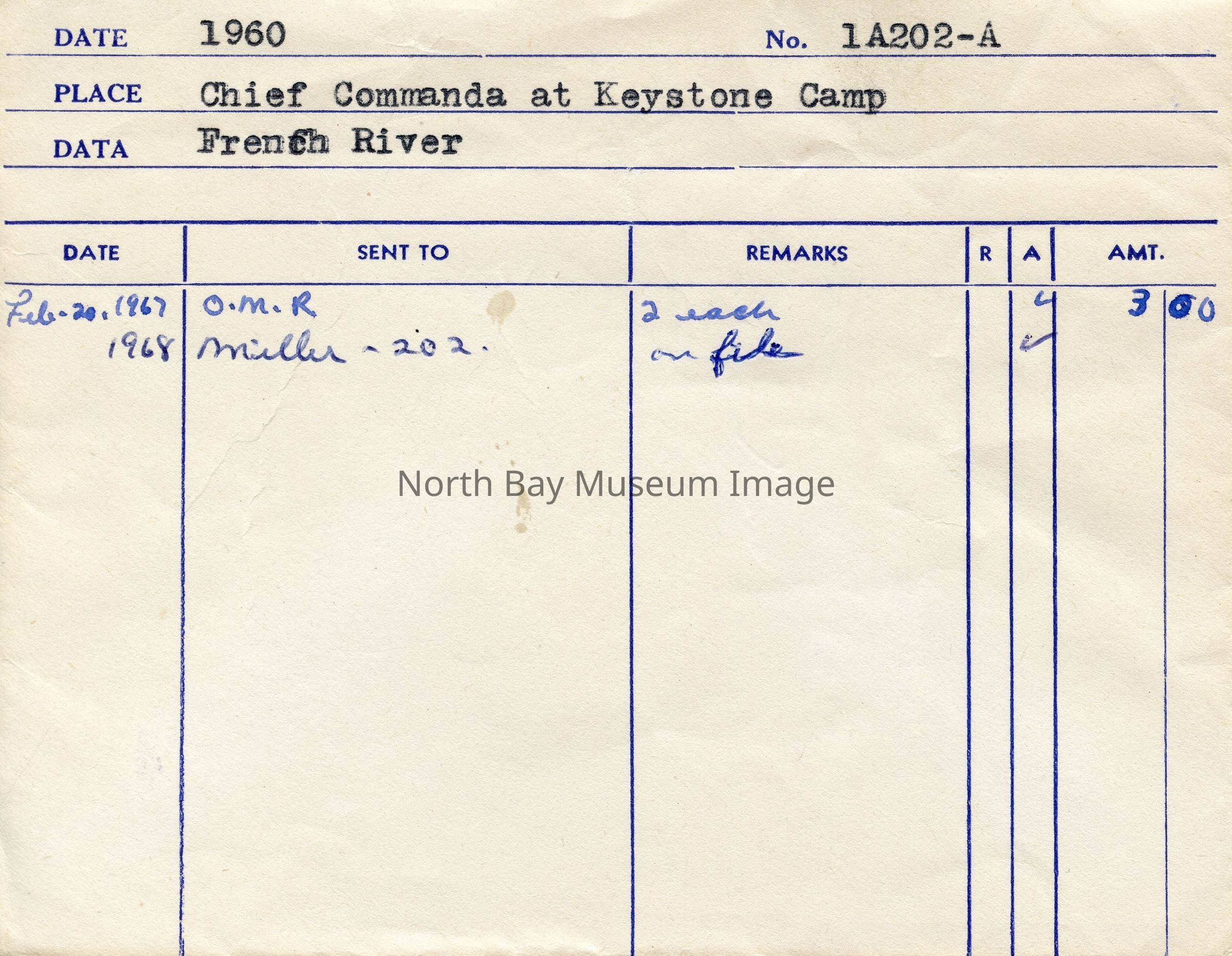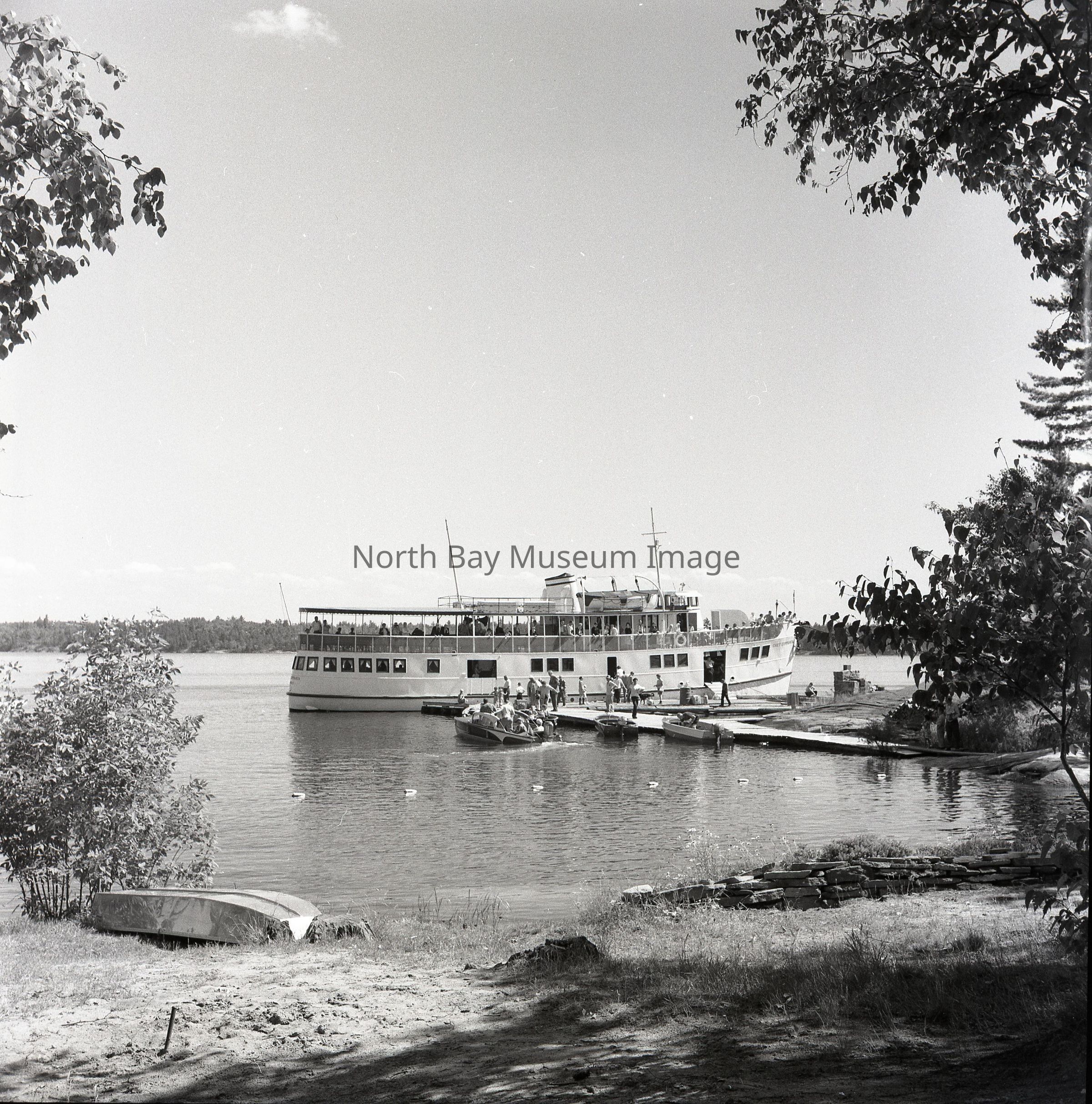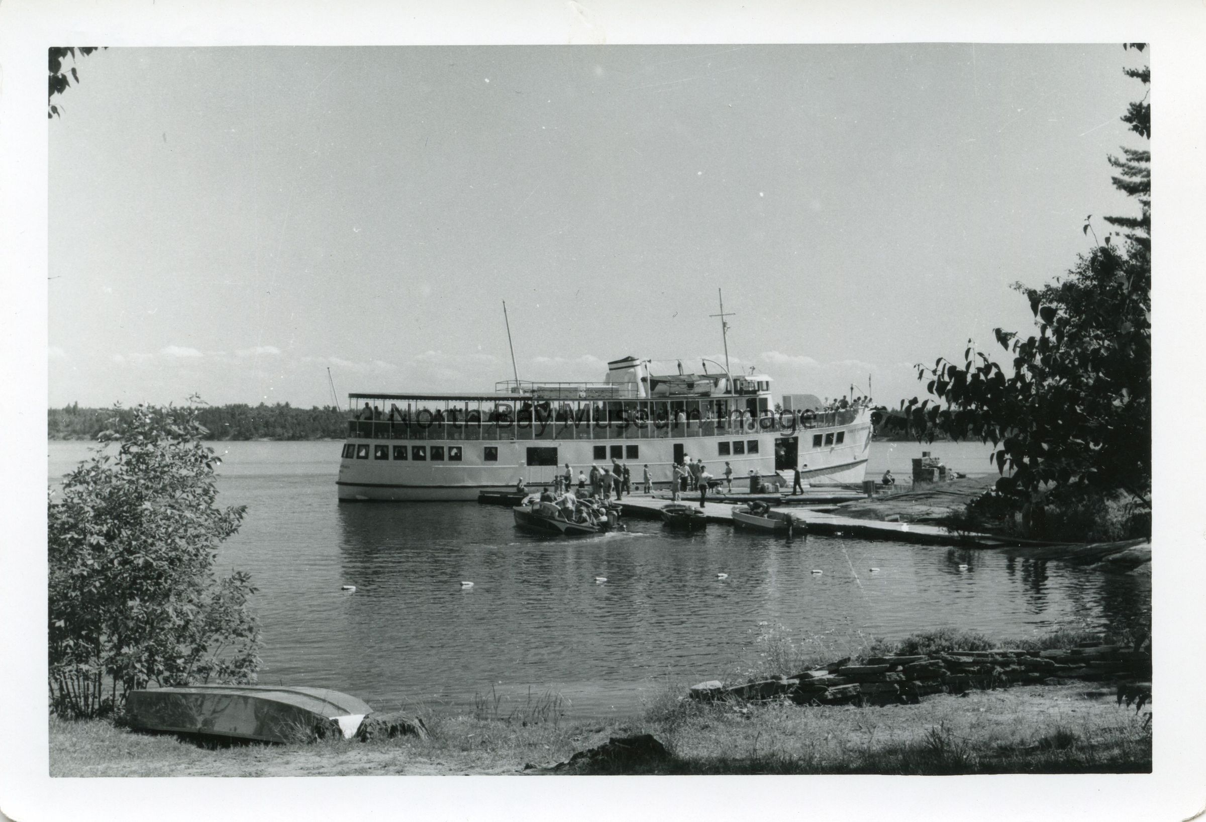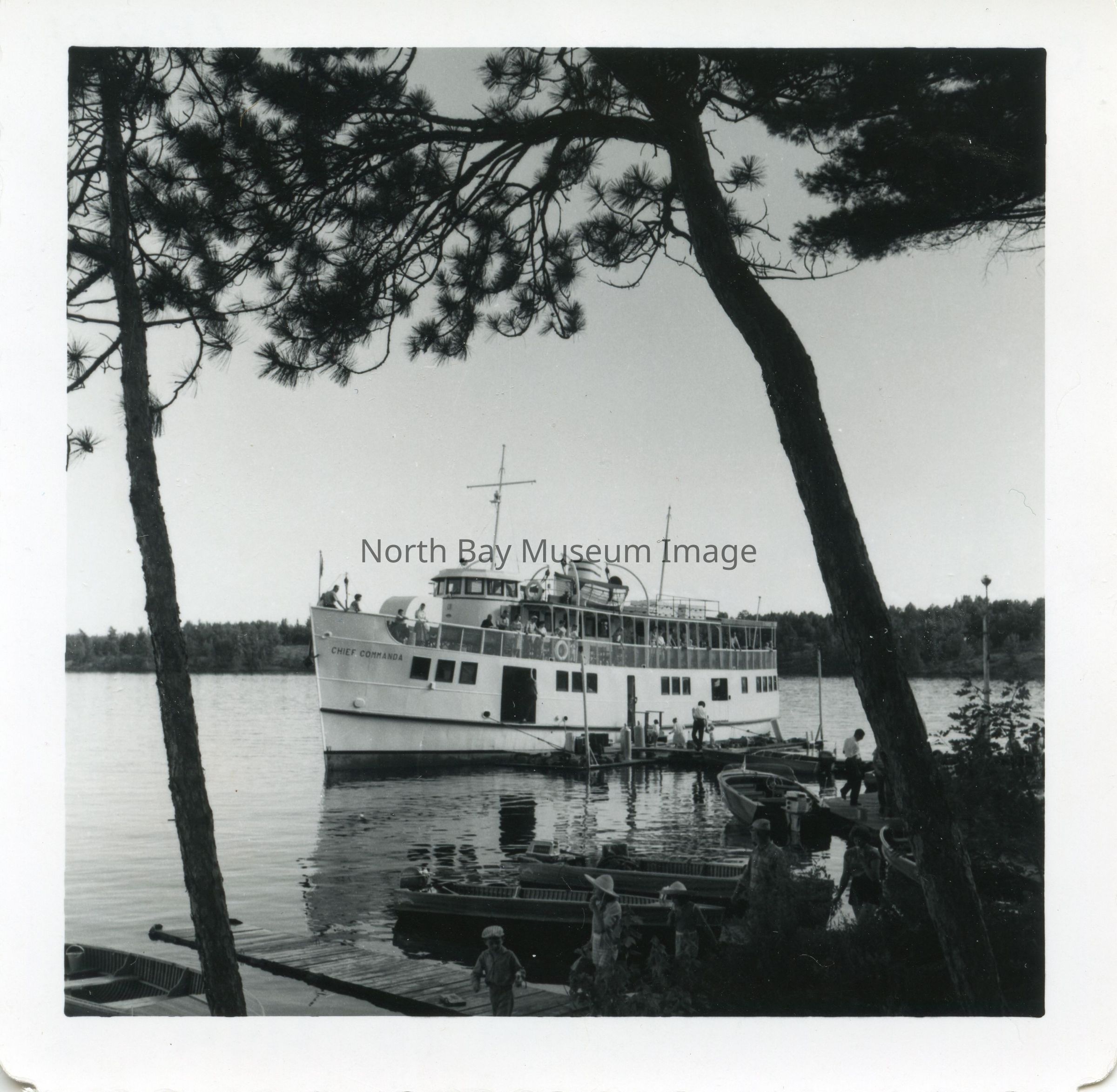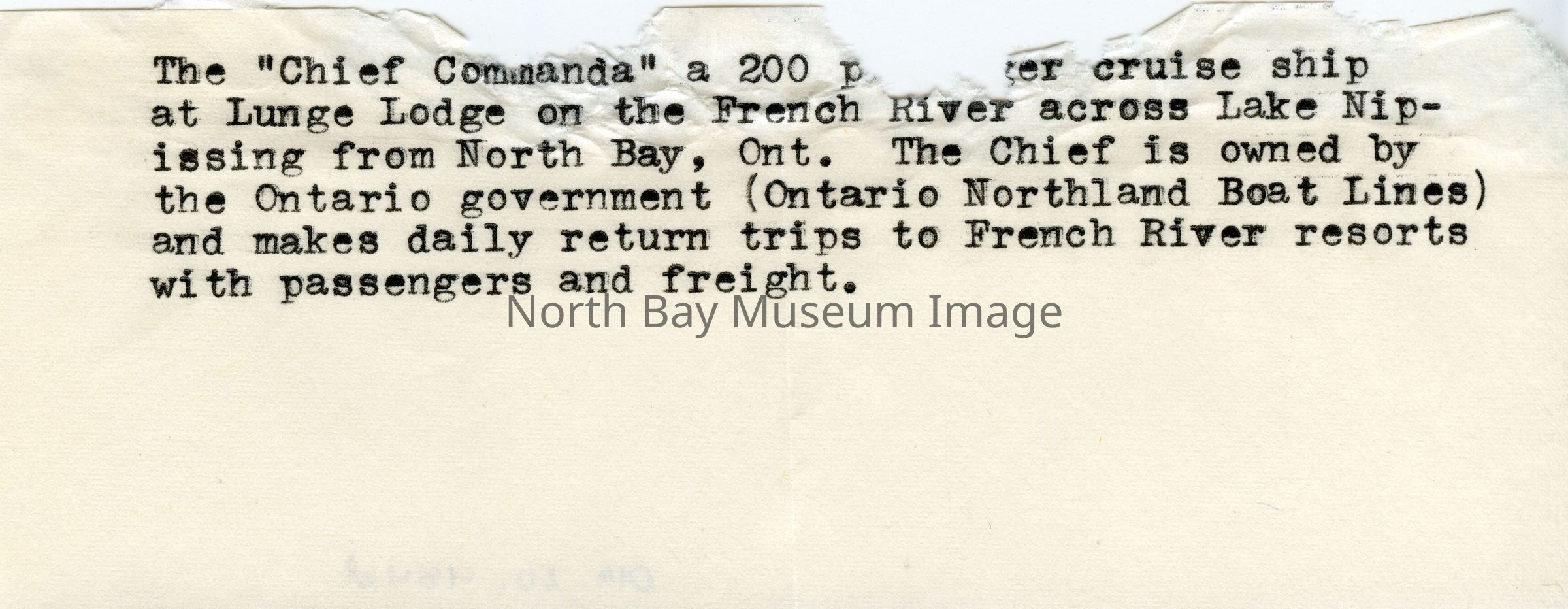 The photographer's envelopes (a-c) contains a small piece of paper with details about the Chief Commanda on it (d). As well as the envelope also contains negatives and photographs (e-l) of the Chief Commanda making various stops along the French River. The paper notes that the Chief Commanda is a 200 passenger cruise ship. The ship was owned by the Ontario Government (Ontario Northland Boat Lines) and that it makes daily trips to French River Resorts with passengers and freight. The images show the Chief Commanda making stops at the Lunge Lodge, the Keystone Camp, and Chaudiere Lodge. The images are all taken from a distance of the ship showing people getting on and off the boat to their various locations. A part of the Forder Collection.Creator
